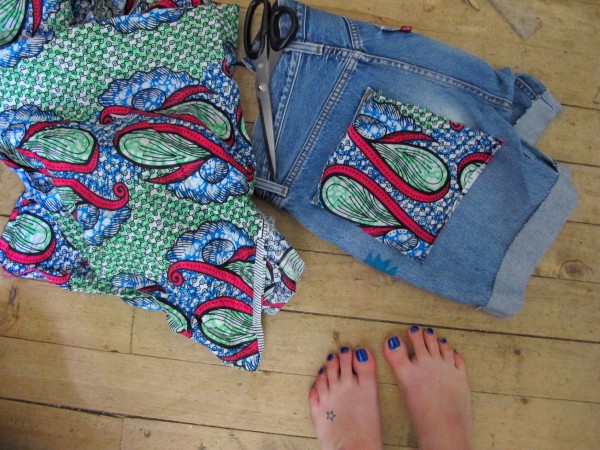 Pour ce petit short, j’avais envie de lui donner un coté plus ethnique en dessinant des motifs style navajo et en cousant un bout de wax sur la poche arrière.