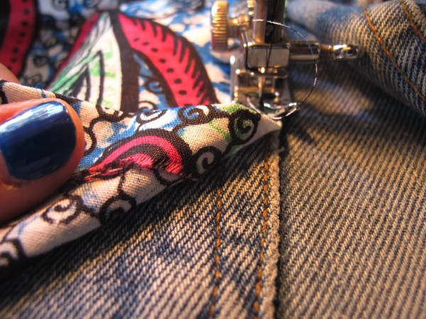 Vous pouvez vous arréter ici ou bien continuer, comme moi, si vous avez la sensation qu’il manque un petit quelque chose, attrapez un bout de tissu wax (vous en trouverez au marché, dans les mercerie ou sur A Little Mercerie en coupon) découpez un carré qui fait grosso modo la taille de votre poche. A ce stade deux possibilités, soit vous avez une machine à coudre alors hop ca va aller sinon utilisez de la colle à tissu (mercerie ou grande surface) et appliquez de léger point de colle sur le contour puis collez y votre tissu. La colle est prévu pour résister au lavage. N’en mettez pas trop, selon les colles le tissu devient rigide au séchage. Le mieux est de faire le test sur un petit bout de tissu au préalable.