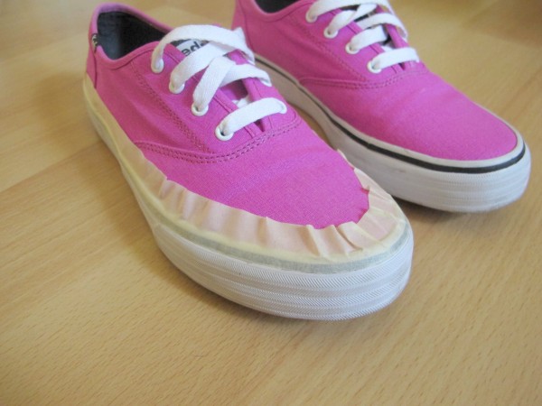 Pour protéger vos chaussures et ne pas déborder avec la colle et les paillettes, mettre du scotch au dessus de vos semelles.