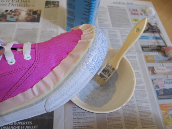 Et enfin, saupoudrez vos semelles de paillettes, tapez légèrement vos chaussures sur le journal pour retirer l’excédant. Vous n’avez plus qu’a laisser sécher.