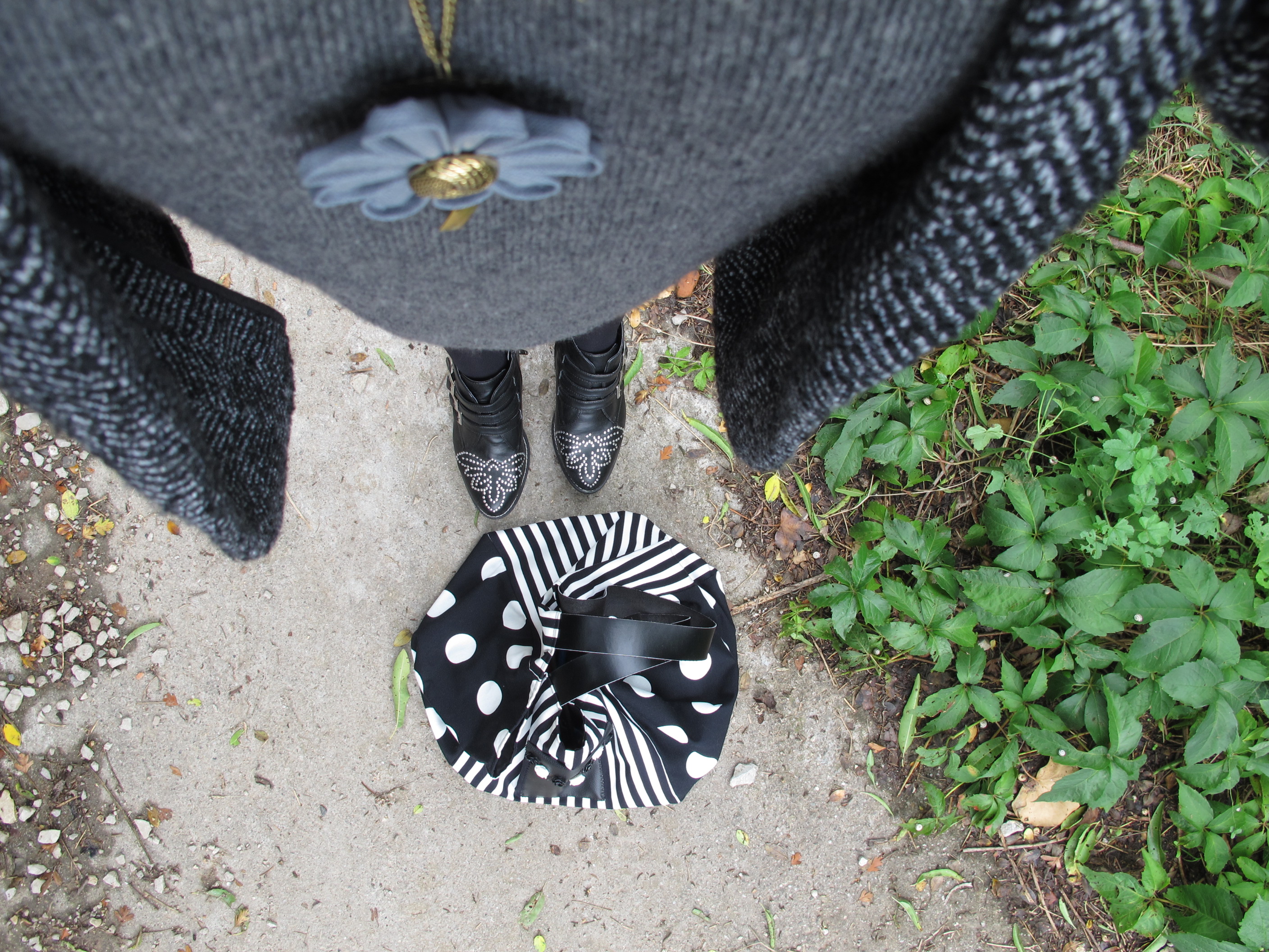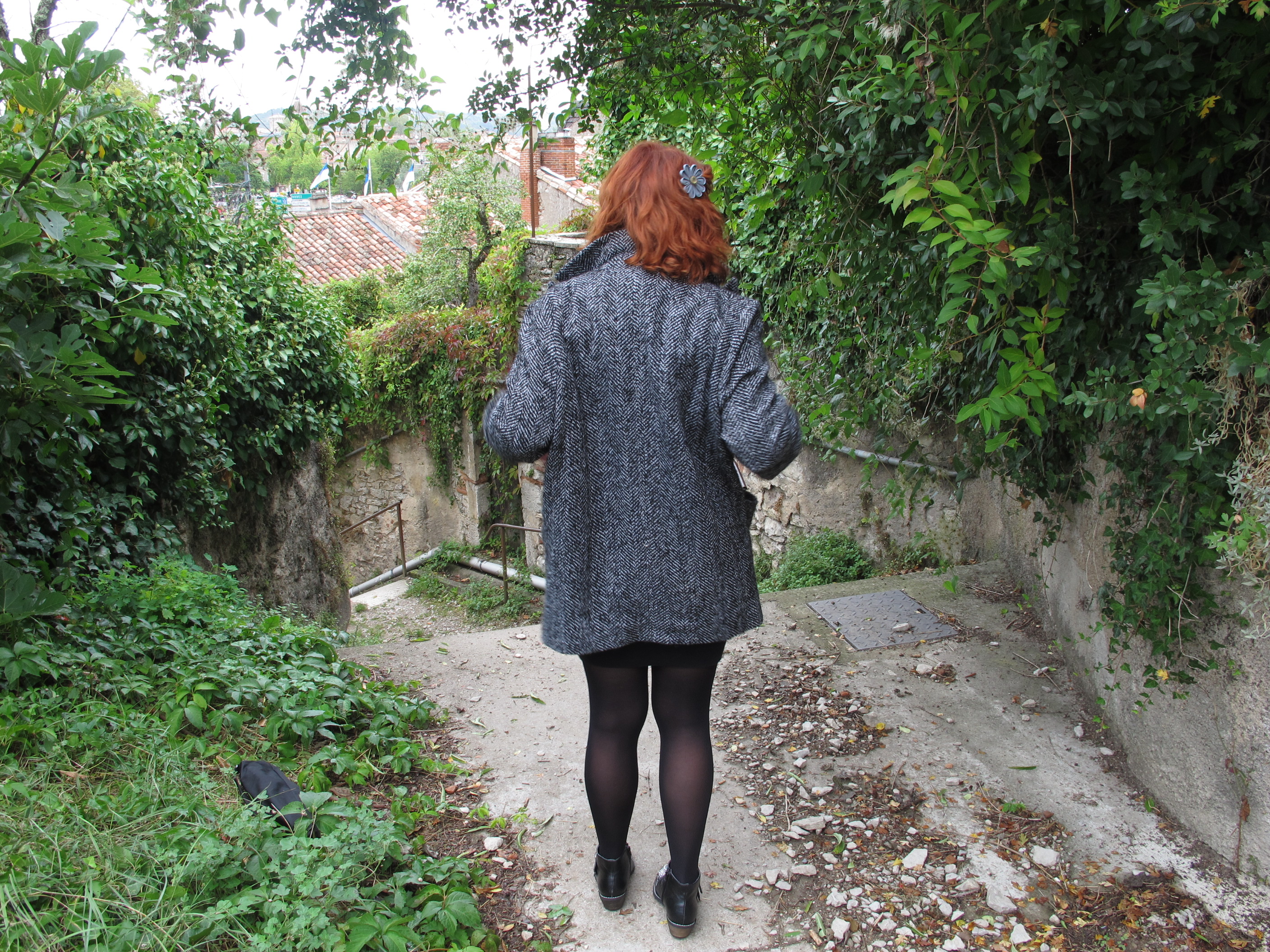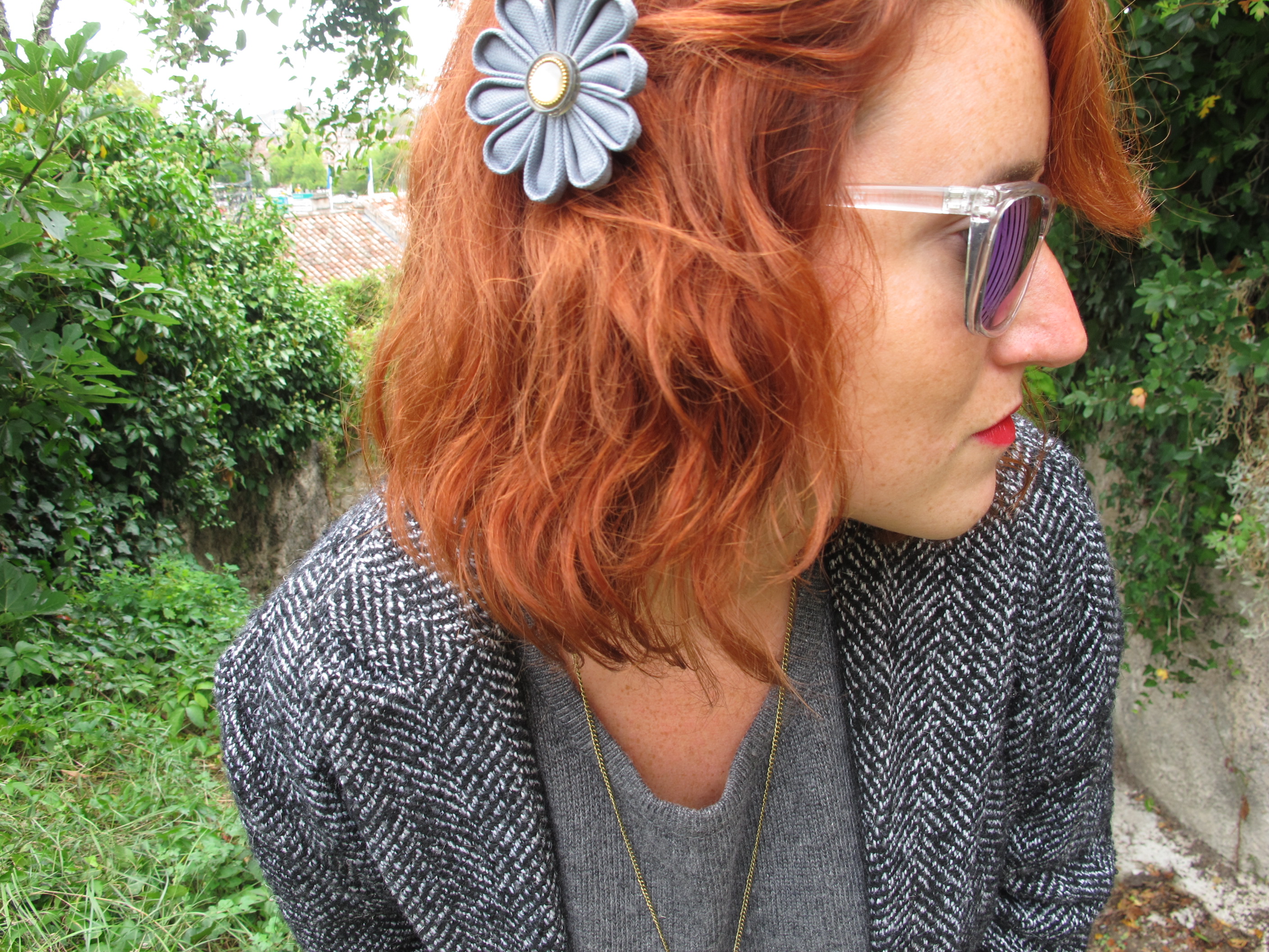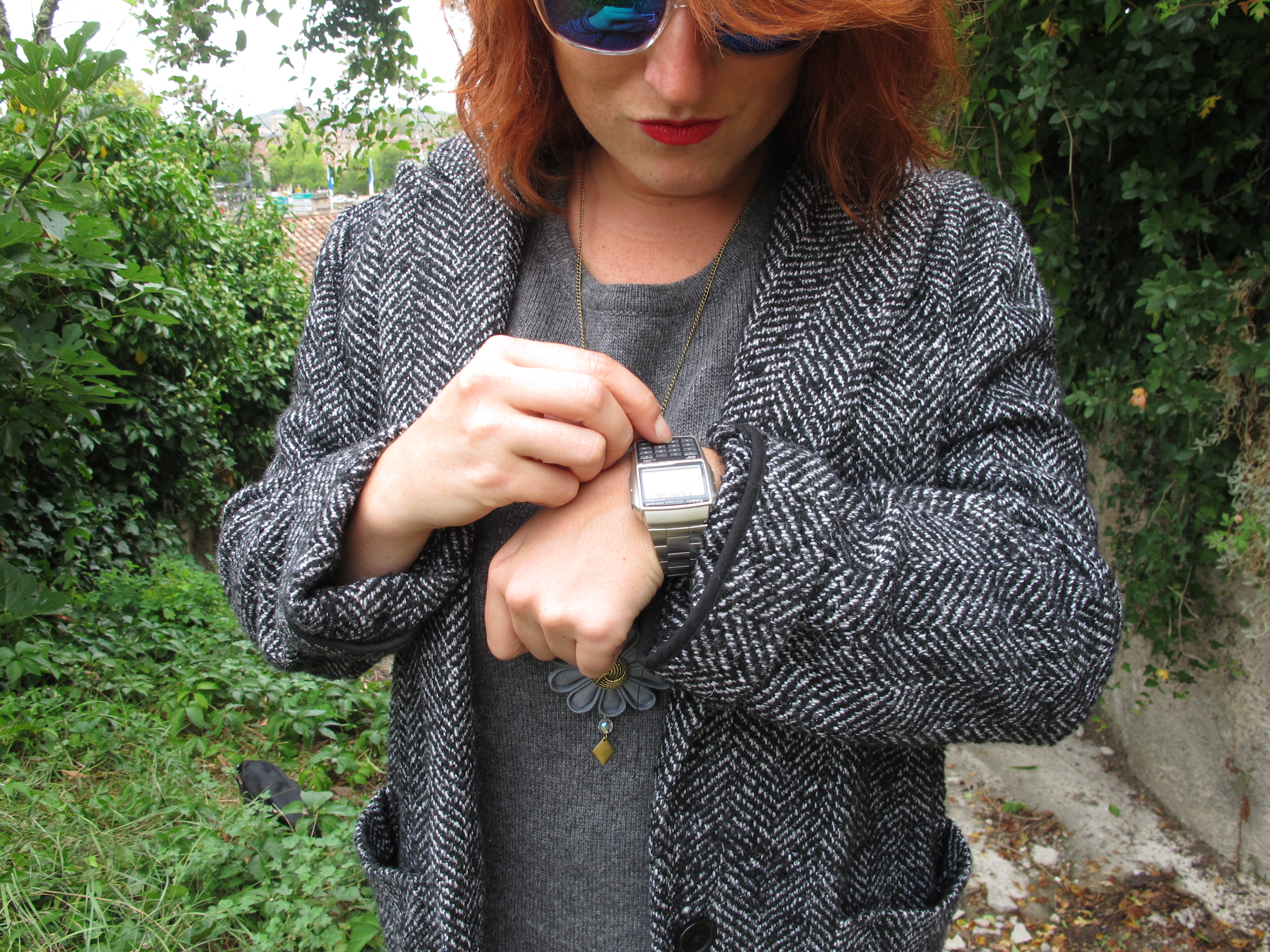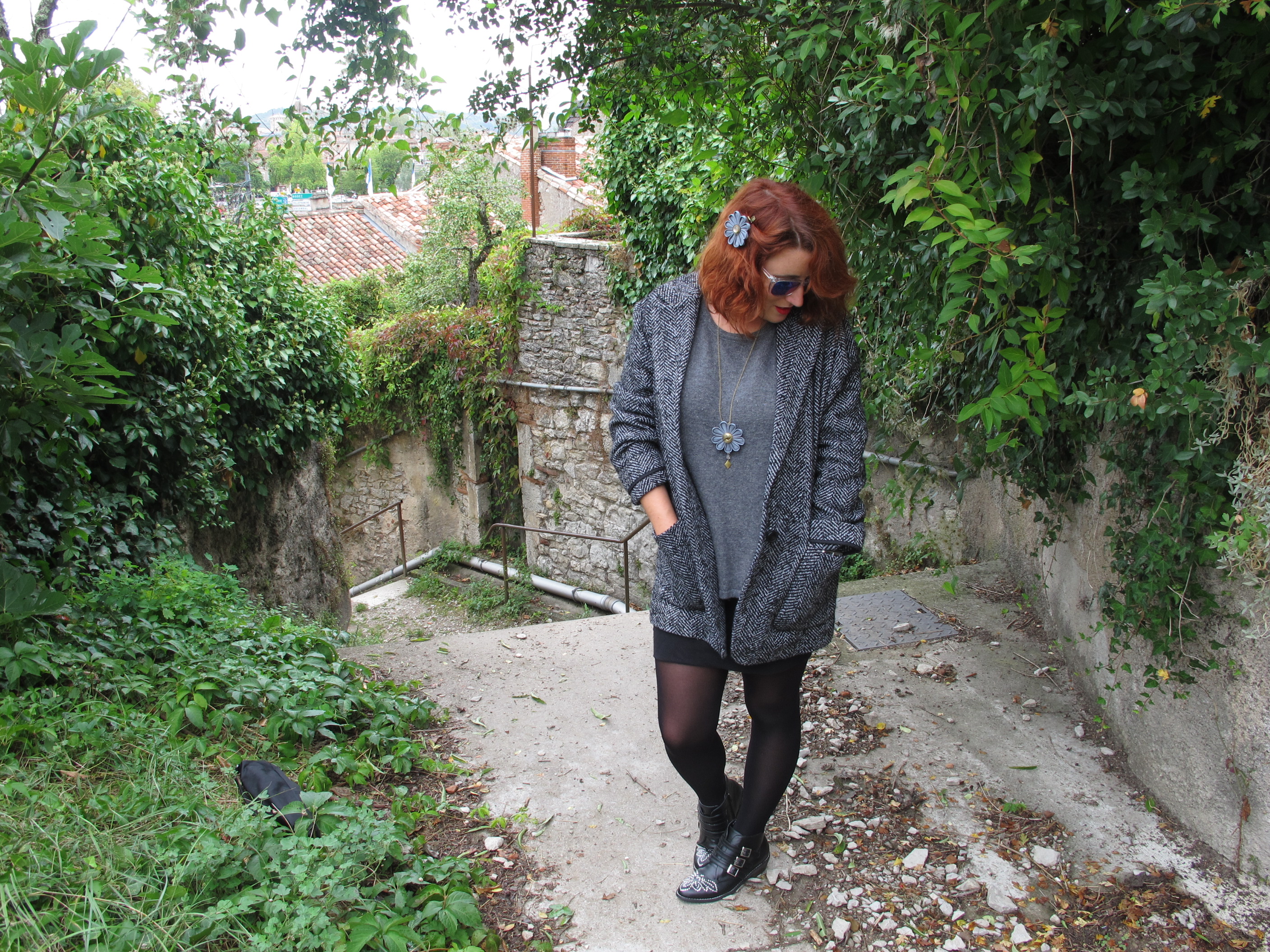 Un look à dominance de gris aujourd’hui avec un mélange féminin / masculin. Ce style n’est pas vraiment celui que j’adopte tous les jours je l’avoue, mais le changement de temps à temps ne fait pas de mal. J’adore la tendance loose, les jeans boyfriend, les veste de grand père, etc… mais est ce ma taille et / ou ma silhouette qui fait que j’ai l’impression qu’on ne me voit plus ou que je parait difforme dans ces coupes, je ne sais pas. Quoi qu’il en soit, j’aime et je tente quand même le coup parfois de sortir ainsi. Comme aujourd’hui par exemple, j’ai laissé mes sneakers compensées et mon perfecto à la maison pour ressortir mes boots à clous et ma veste de papi en mixant cela à une mini jupe tube et des collants opaques. Qu’en pensez vous? Je persévère ou je lâche cette tendance qui n’est pas faite pour moi?
