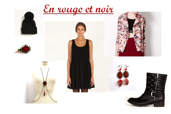 Sur cette planche, la pièce centrale est une robe noir bi matière Pimkie à shopper ICI. J’adore la coupe des perfectos, moins strict qu’une veste de tailleur et bien plus rock et fun, alors quand j’ai vu celui ci, chez bershka, j’ai eu un gros coup de coeur, à retrouver d’urgence ICI. Pour les chaussures, ICI, des bottes style motard de chez Pimkie avec leur effet matelassé, miam miam! Un petit bonnet à pompon pour ne pas choper froid ICI et enfin, le clou du show, évidement je mise sur mes créations, la chaine de corps, la barrette à clipser sur le bonnet et les BO rouge pailletté à plume, tout ceci à retrouver dans la collection Cléo sur l’ehop ICI.