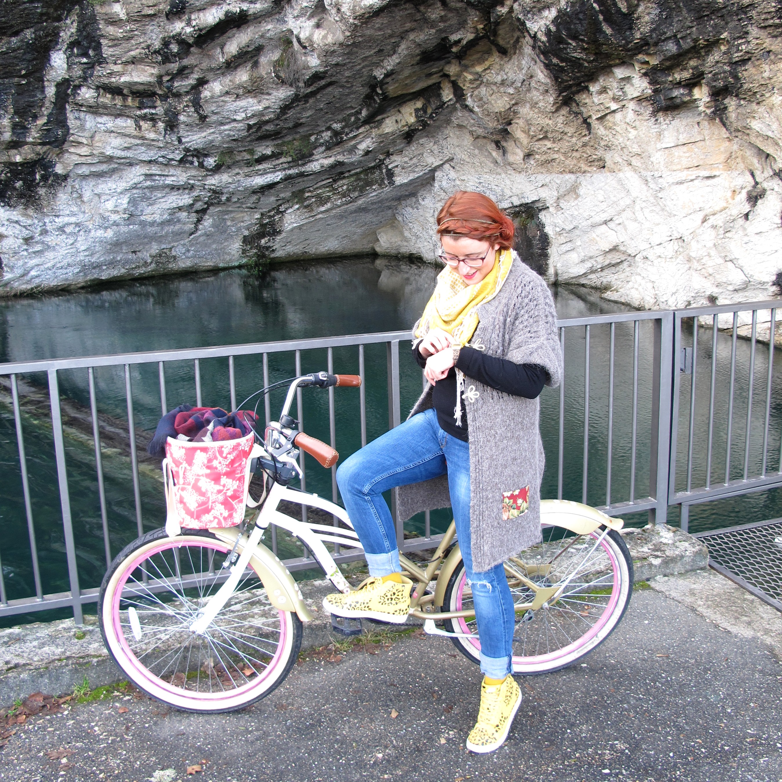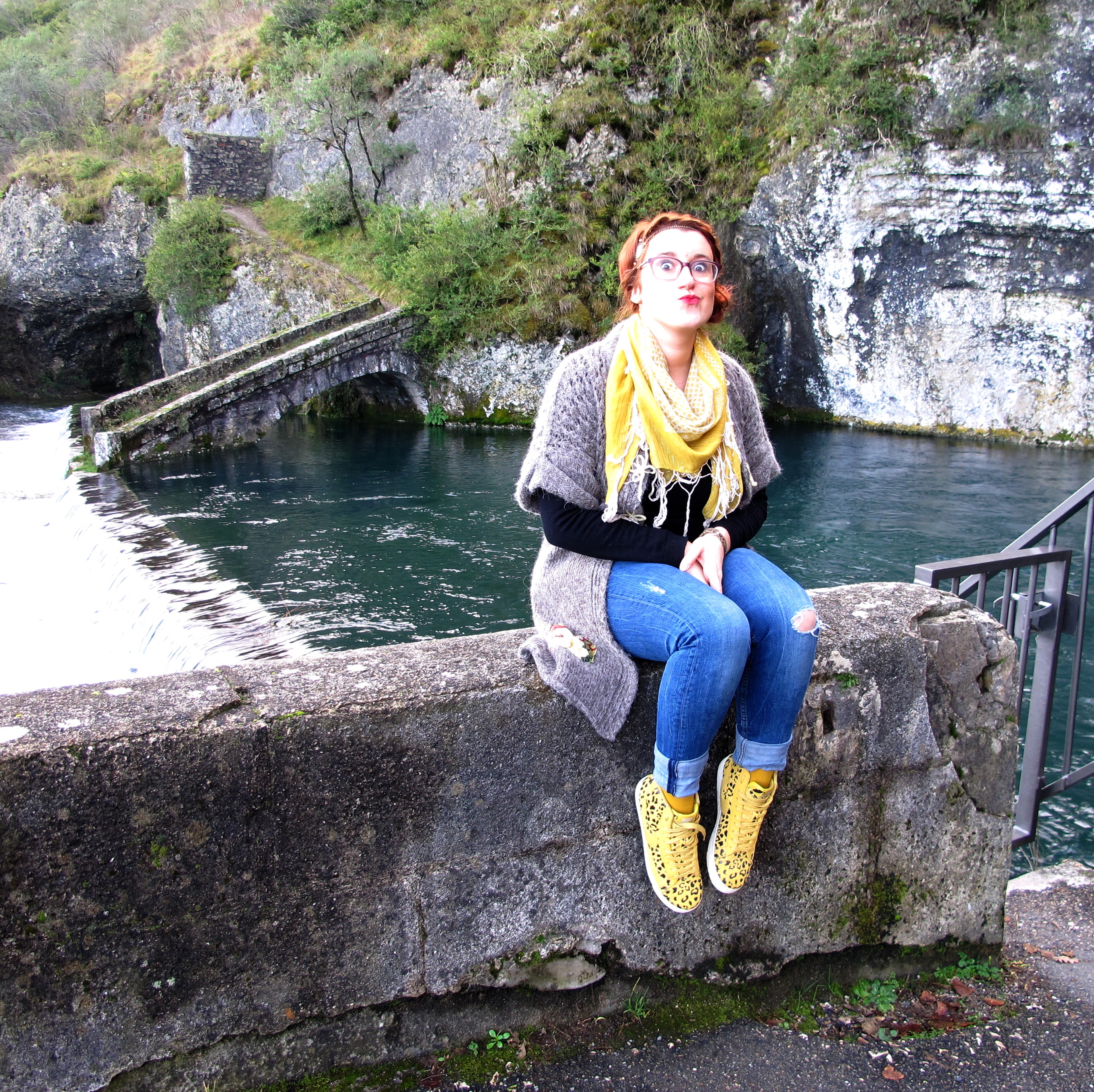 Revenons en au look du jour, un look pris en photo lors d’une balade à vélo en amoureux, nous nous sommes arrêté devant cet endroit, à coté du pont Valentré, à Cahors, si je ne dis pas de bêtise c’est la fontaine des Chartreux. Et donc, pour cette petite balade, un look à la cool: gilet doudou customisé par mes soins, jean et baskets aux pieds. A la cool quoi!