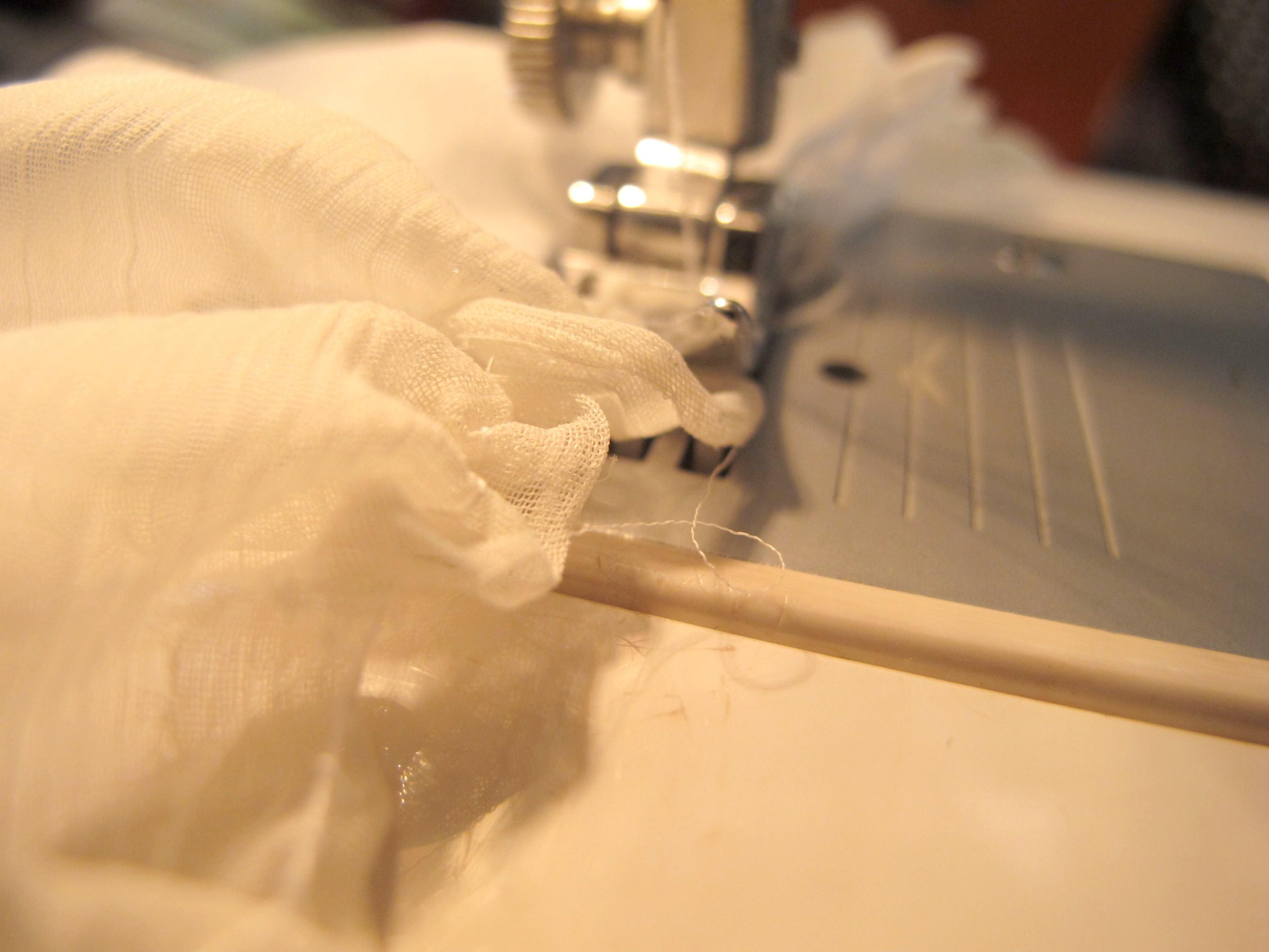 Deuxième étape: faire une couture lâche (à la main ou à la machine) en haut du tissu puis tirez sur le fil pour froncer votre tissu.