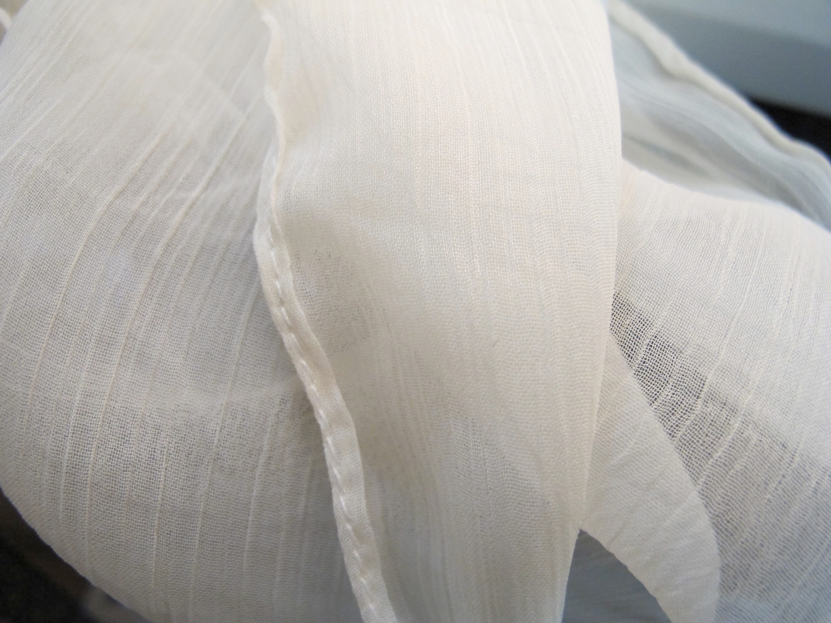 Concernant les dimensions du coupon de soie, c’est à vous de juger selon l’effet que vous souhaitez donner. Large ou plus court, tout le tour de l’encolure, uniquement le devant ou même 15cm sur le devant au centre, très froncé ou peu, … c’est très aléatoire. Au plus vous souhaitez un effet froncé, au plus il vous faudra du tissu, en effet lorsque l’on fronce la longueur du tissu se réduit de plus en plus alors pensez y lors de vos découpes.