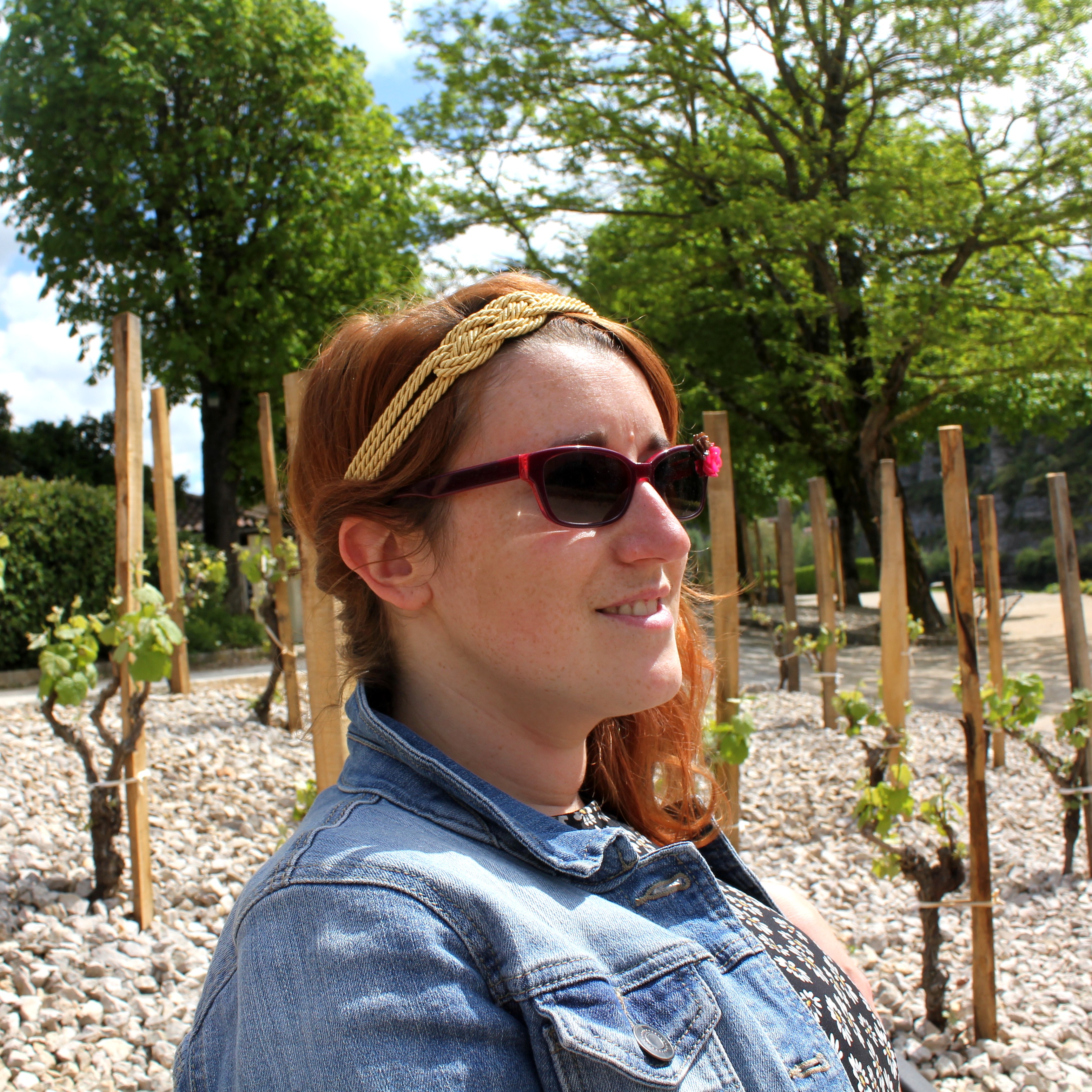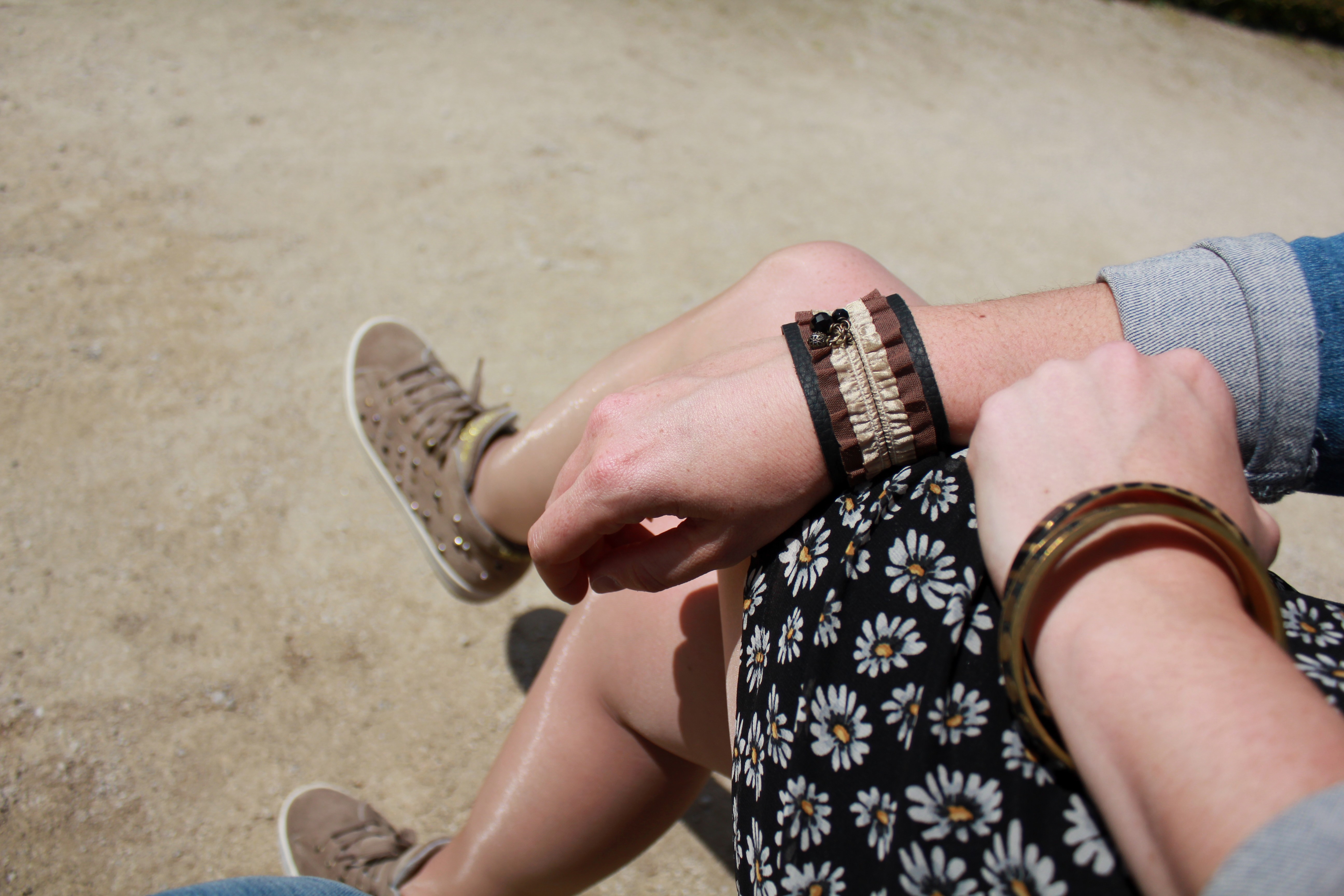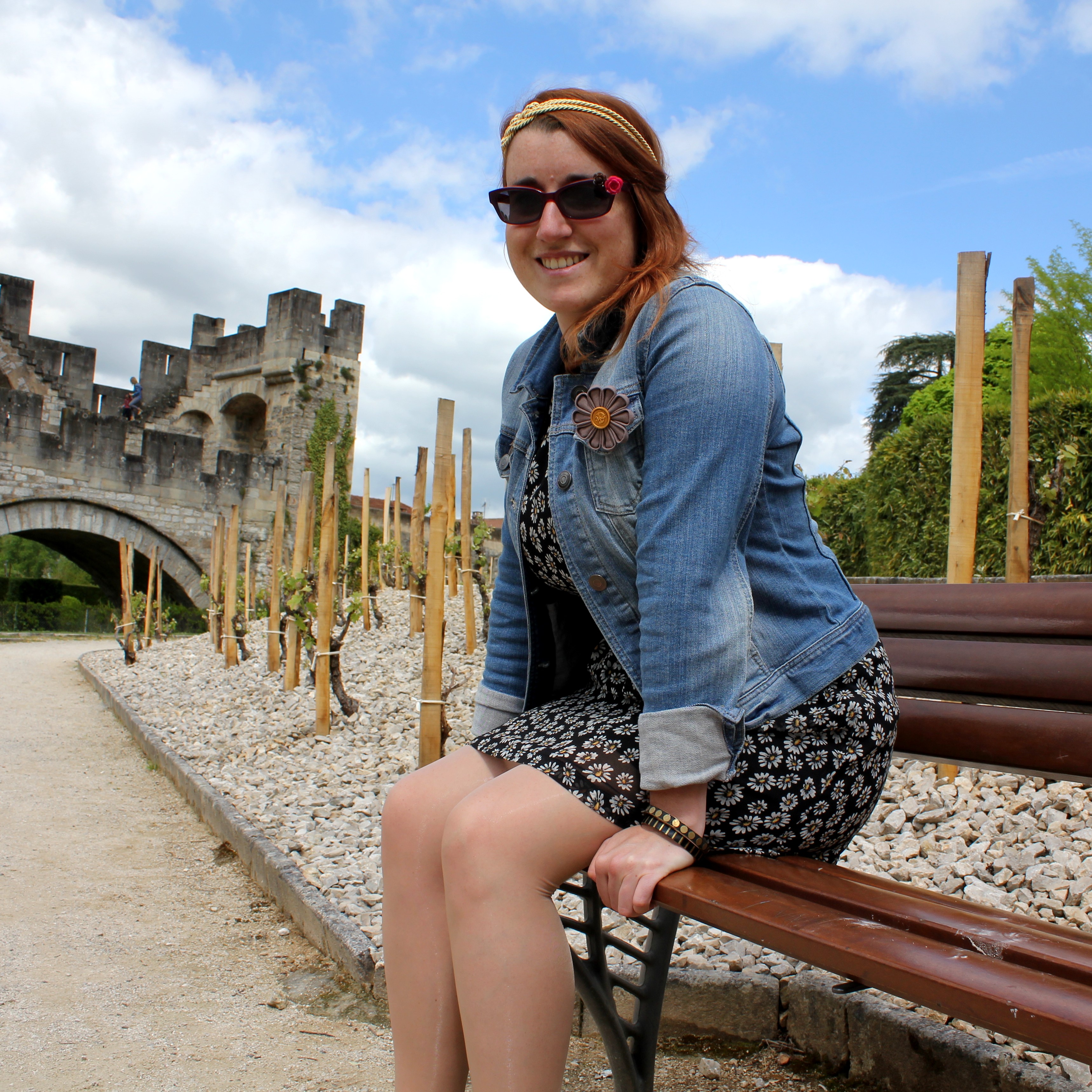 Je porte une robe marguerite Pimkie, une veste en jean Zara, chaussures No Name, headband fin de série Mamzel Tutu, manchette Satine, lunettes DIY.