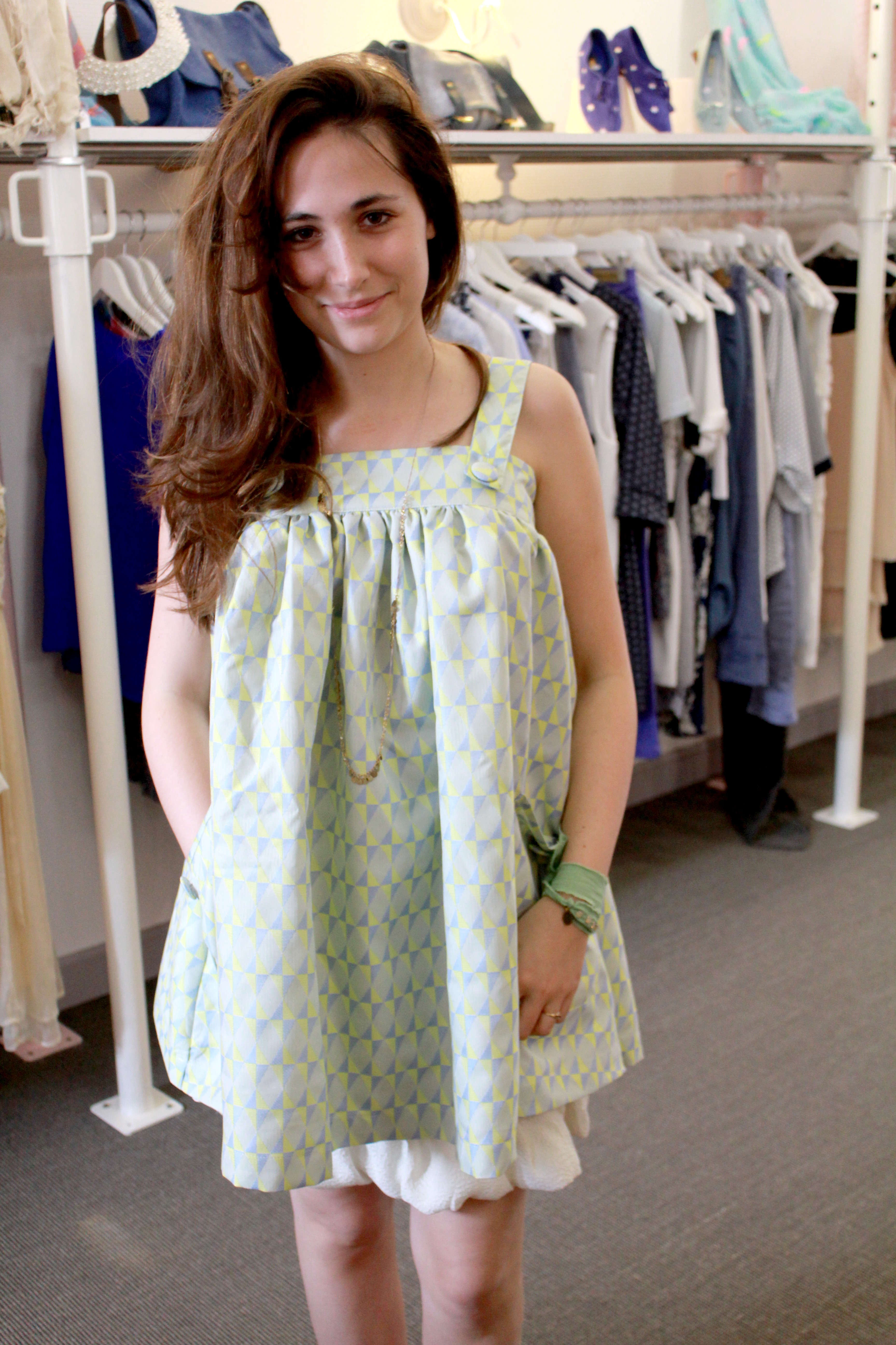 Voici une tenue que j’aime beaucoup, cette robe est originale avec cet imprimé graphique et cette forme très rétro « baby doll » portée par Romane.