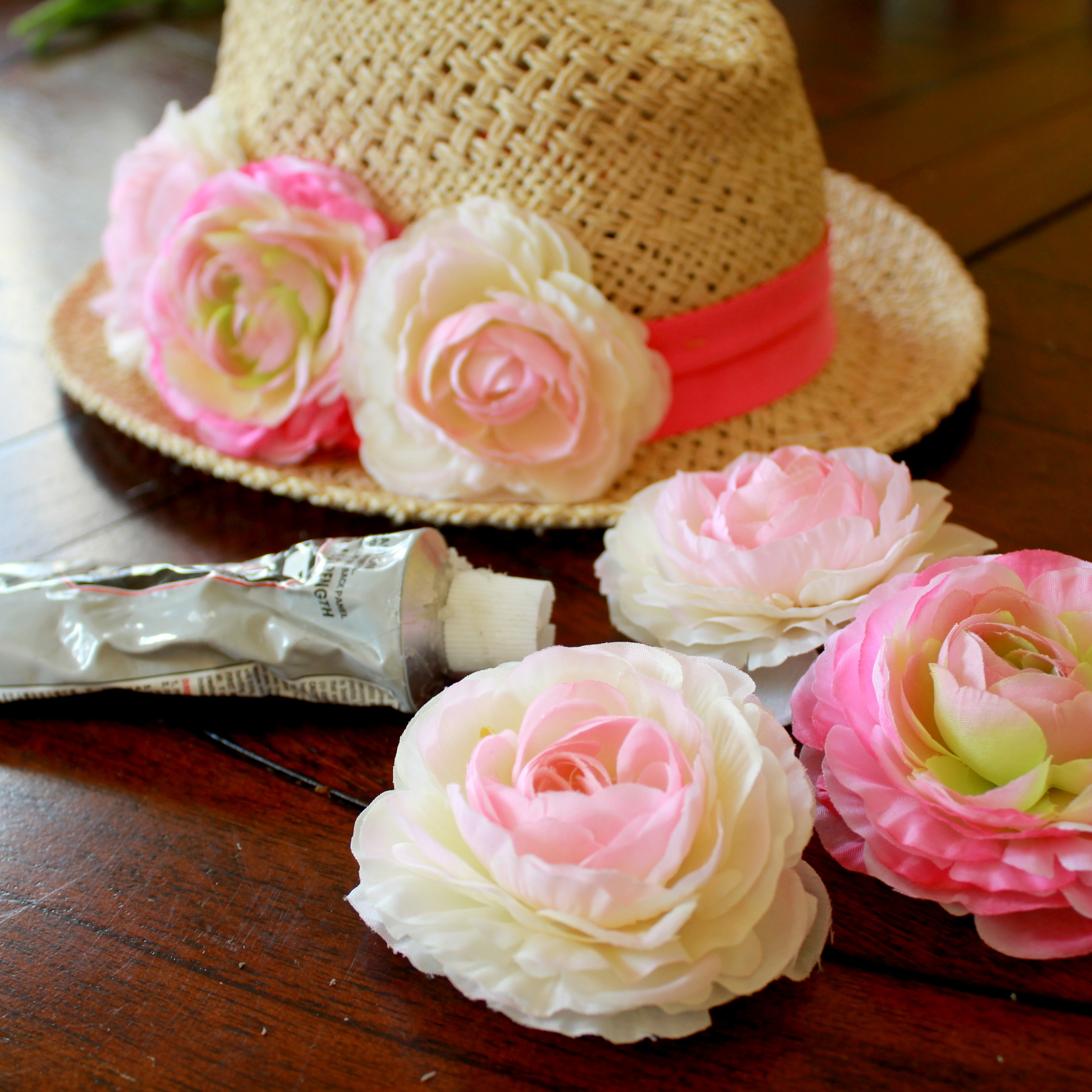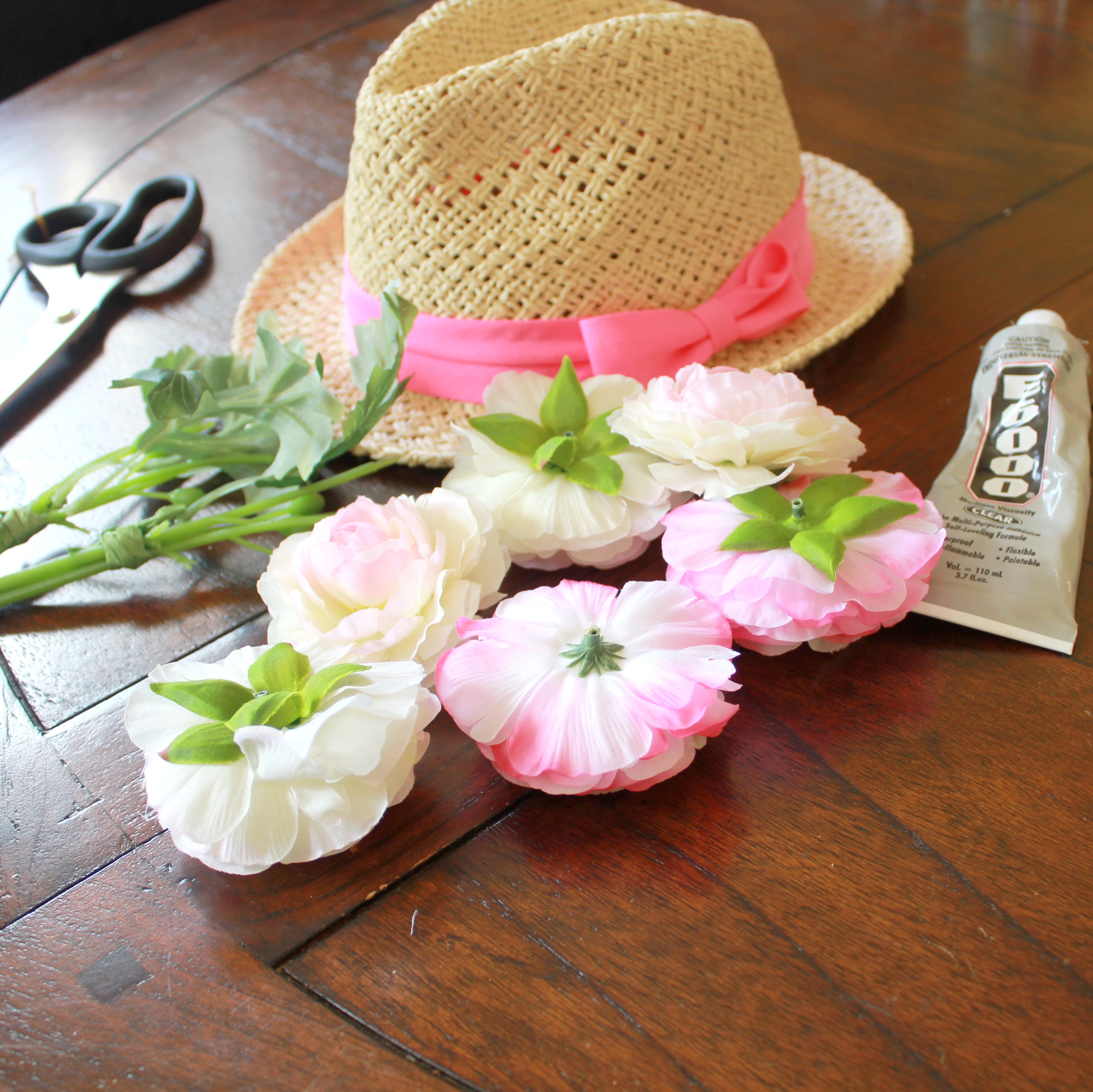 Retirez les fleurs de leur tige. Appliquez de la colle au dos de chacune et disposez les à votre guise sur le tour du chapeau.
