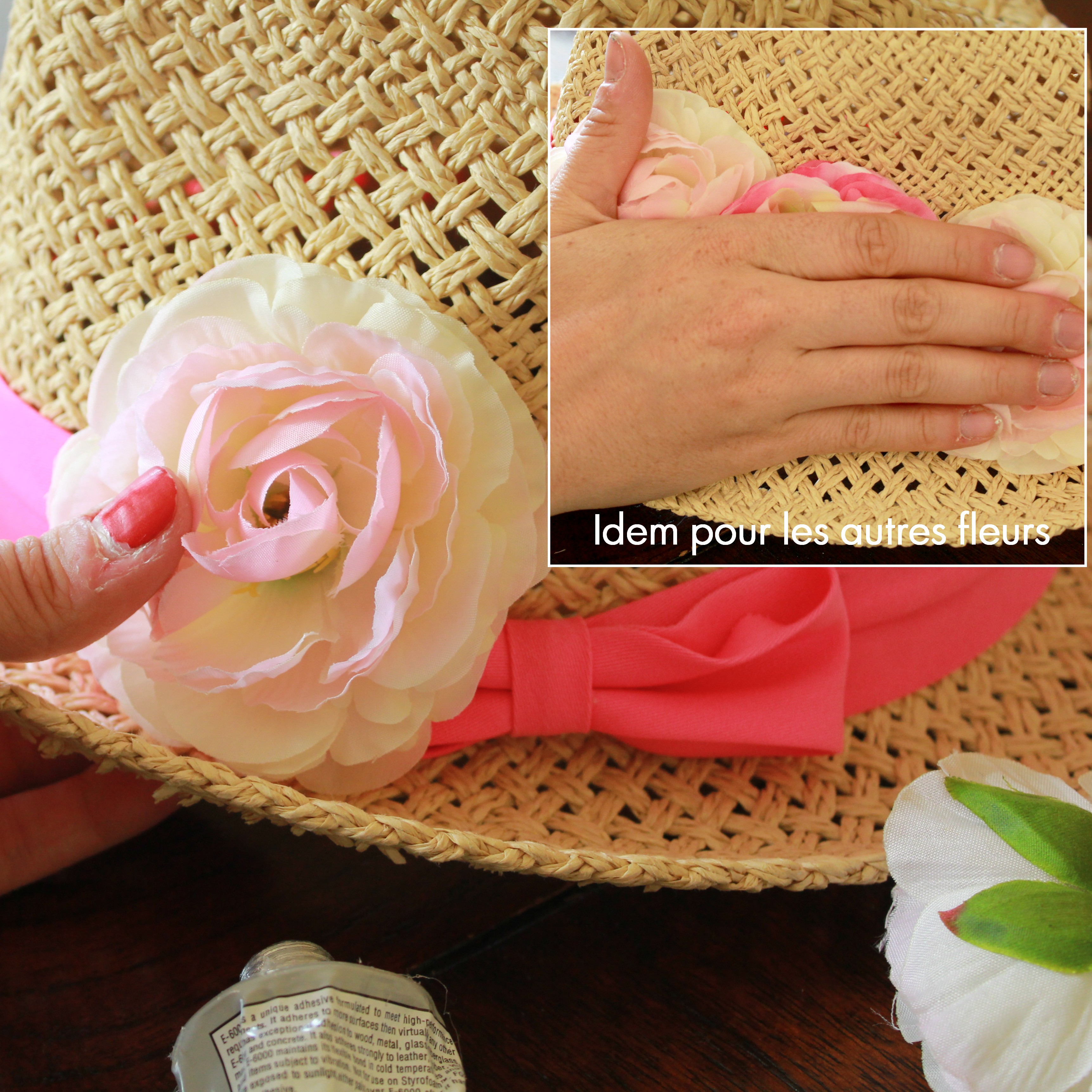Appuyez quelques instants les fleurs contre le chapeau pour que la colle prenne correctement.