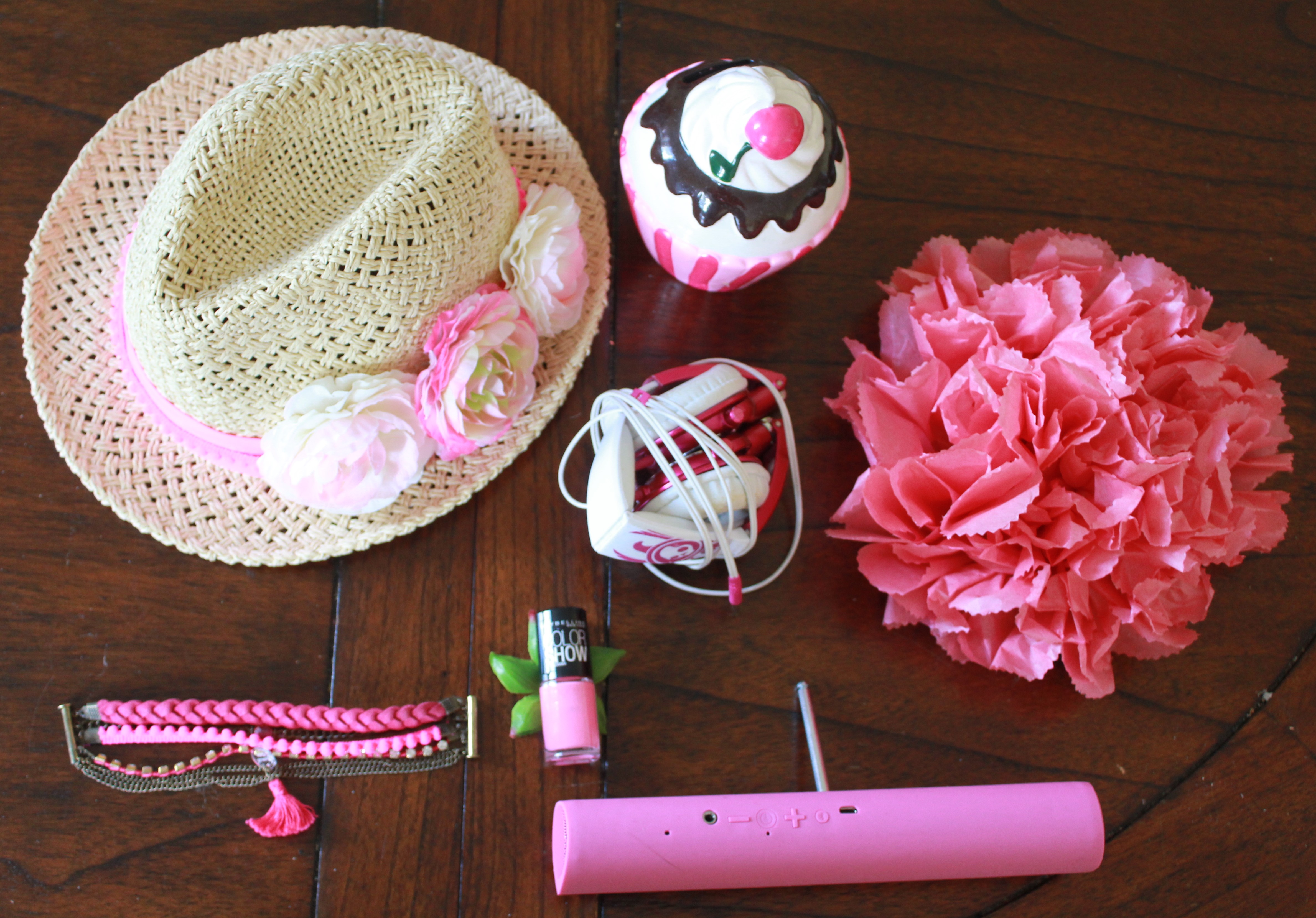 Pompon en papier de soie fait maison, tirelire cupcake New look, casque Skullcandy, station d’écoute Zooka, manchette Mamzel Tutu. Panoplie parfaite pour un été tout rose!