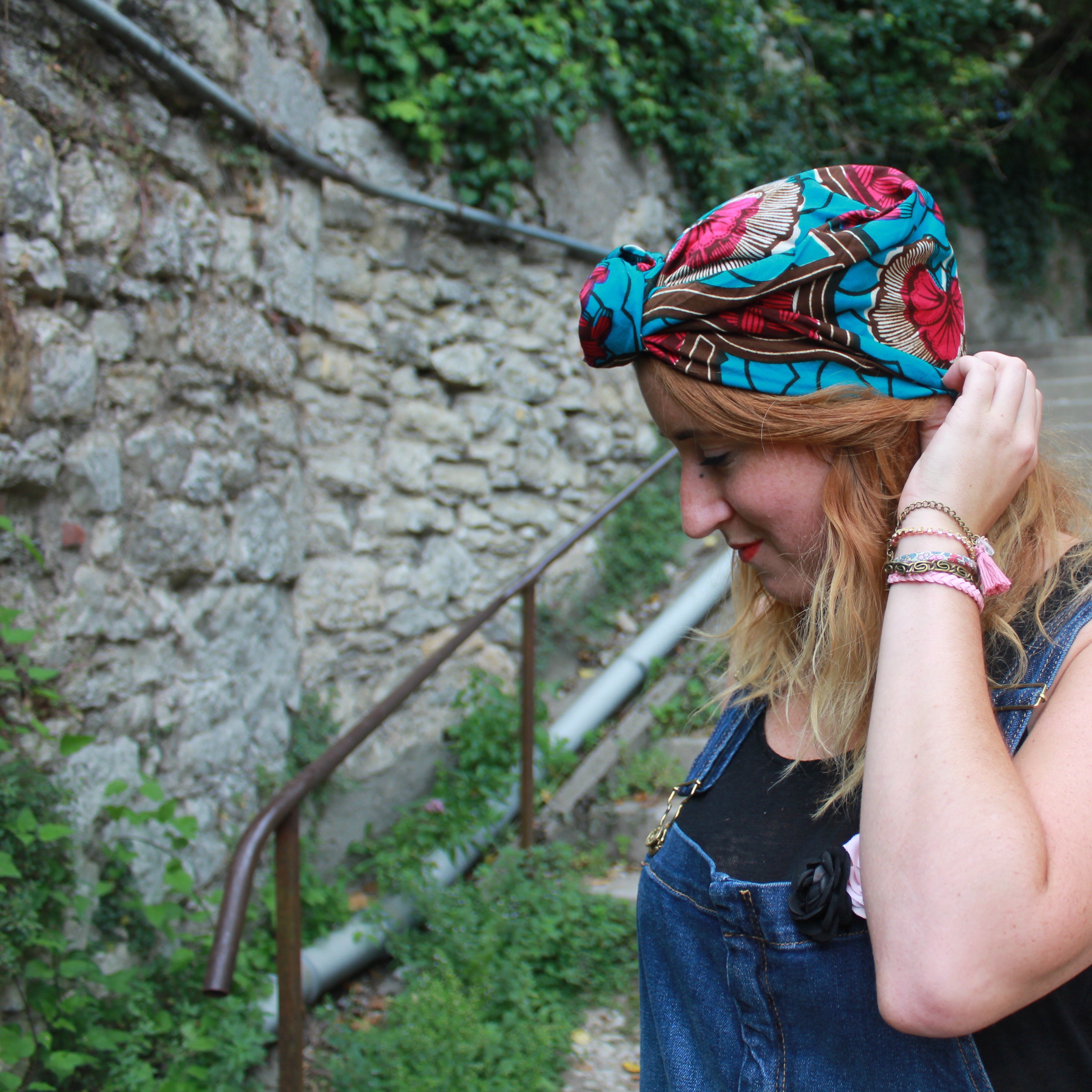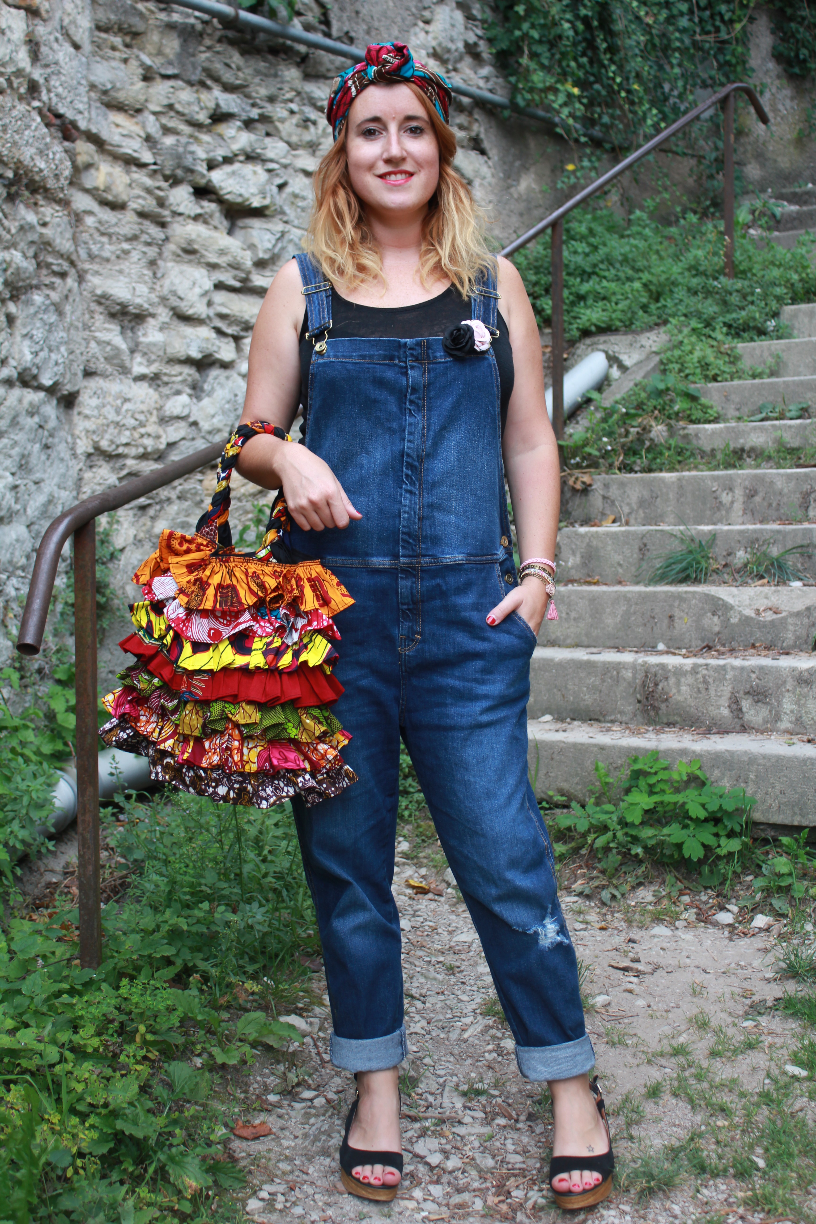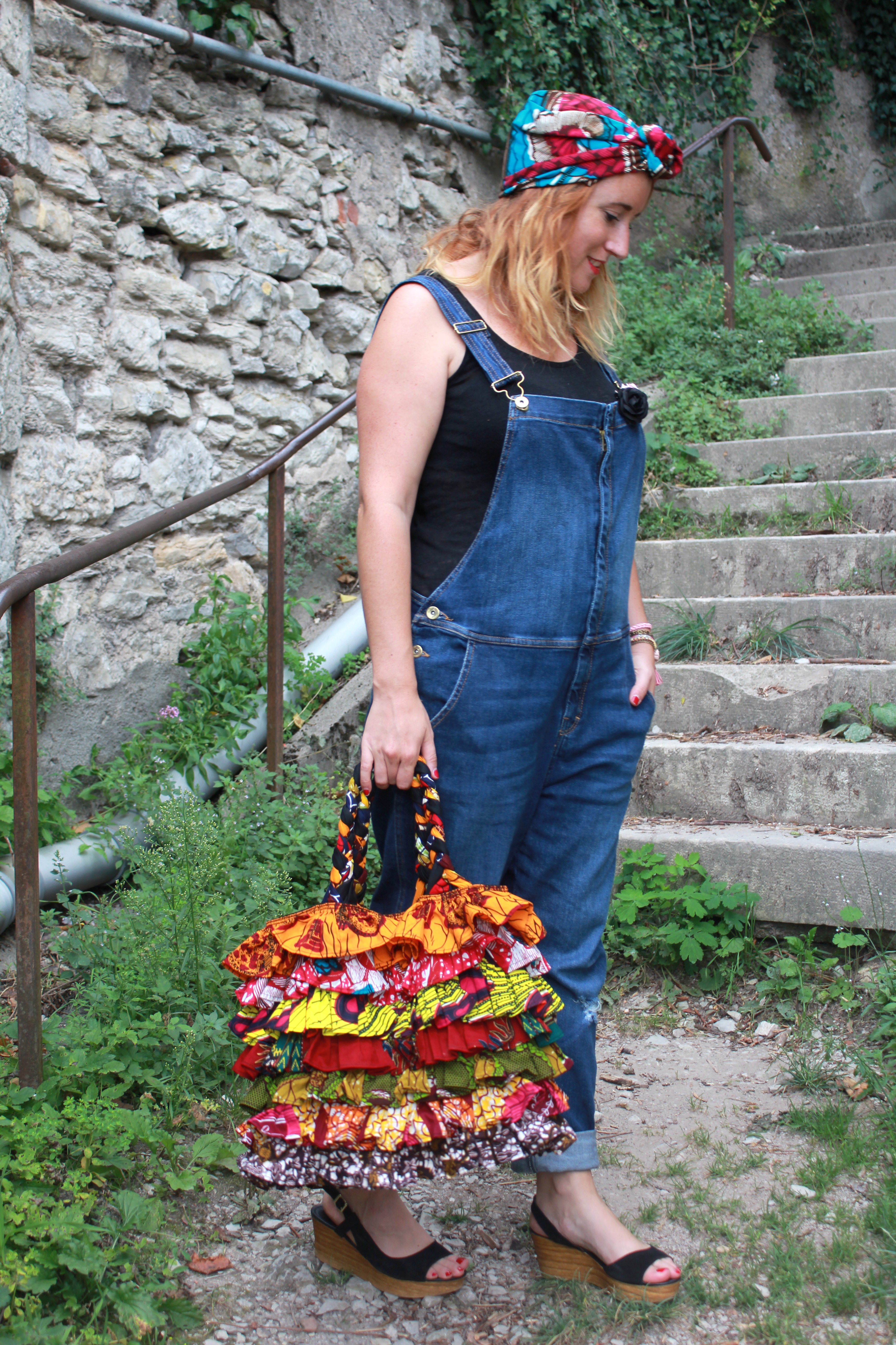 Salopette: Mango / débardeur: Etam / sac: Miss Eben Cicefa / foulard turban: Mamzel Tutu / chaussures: André / Manchette: Mamzel Tutu