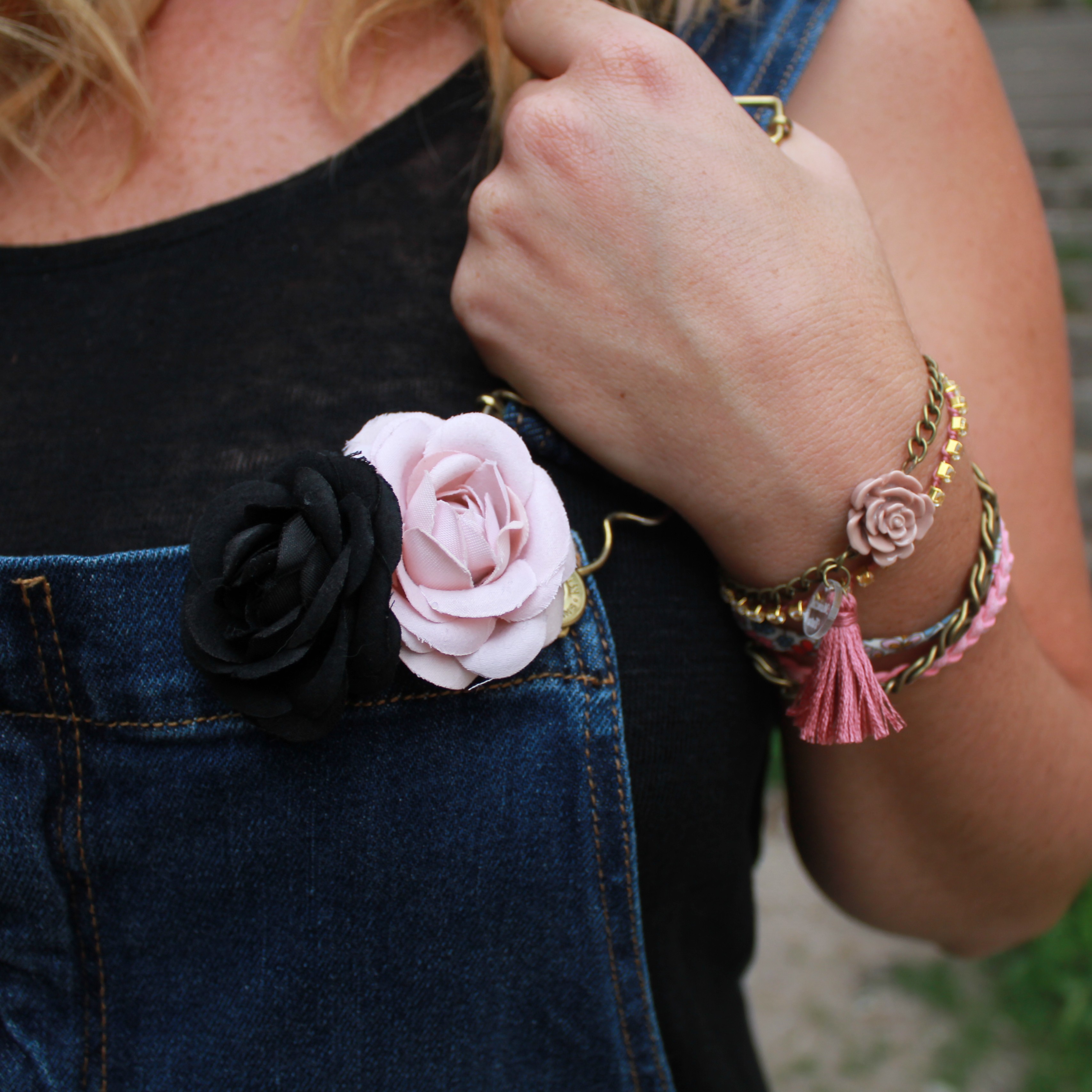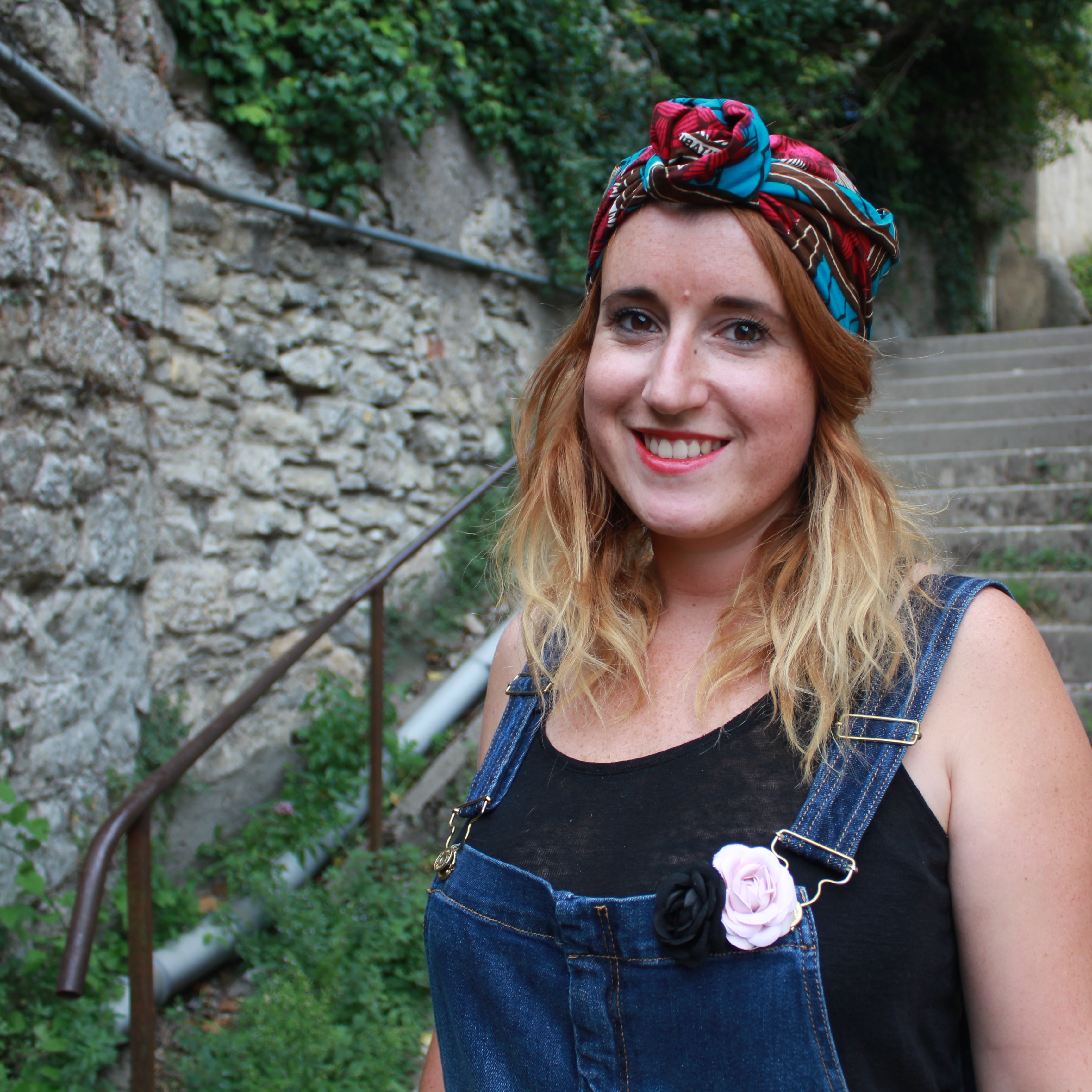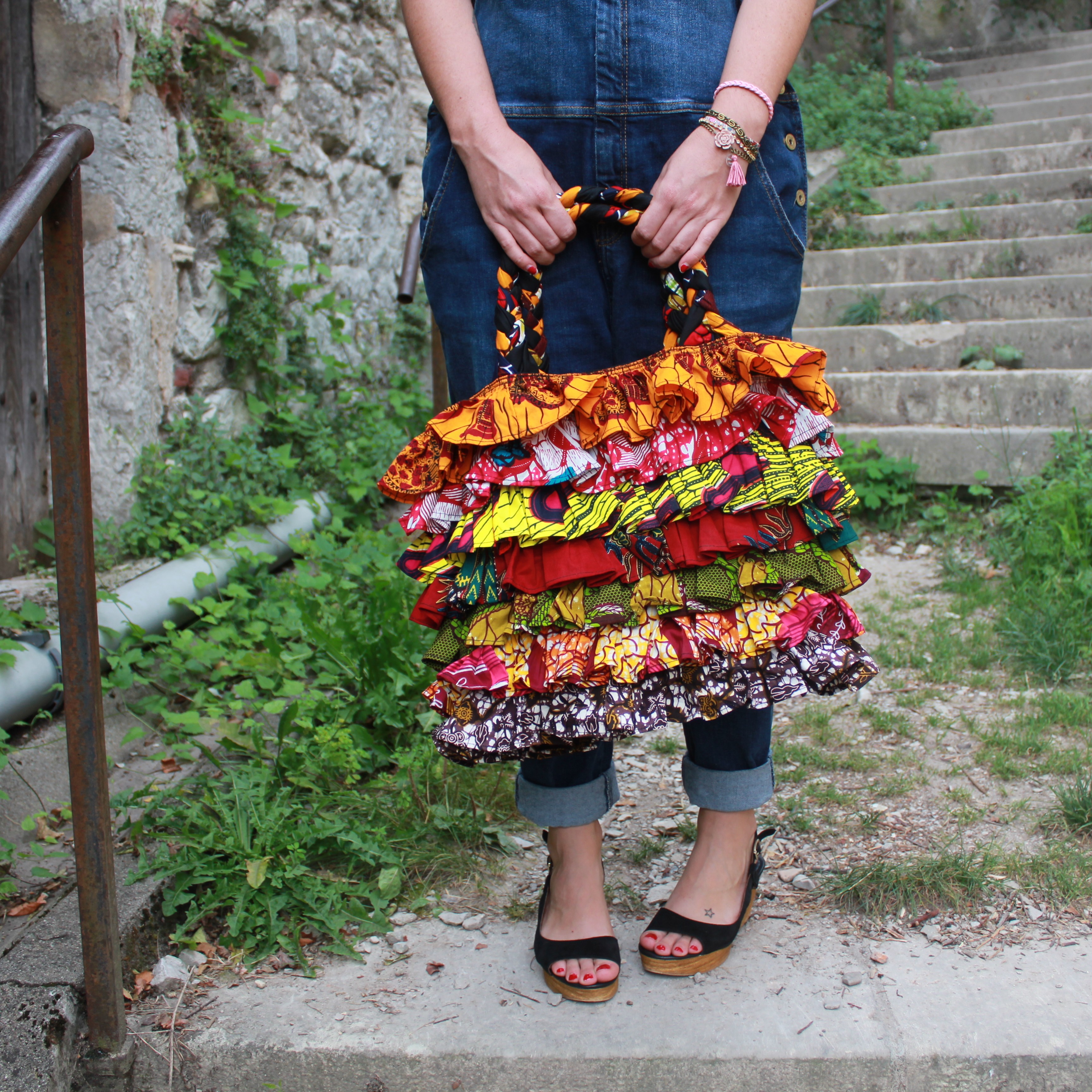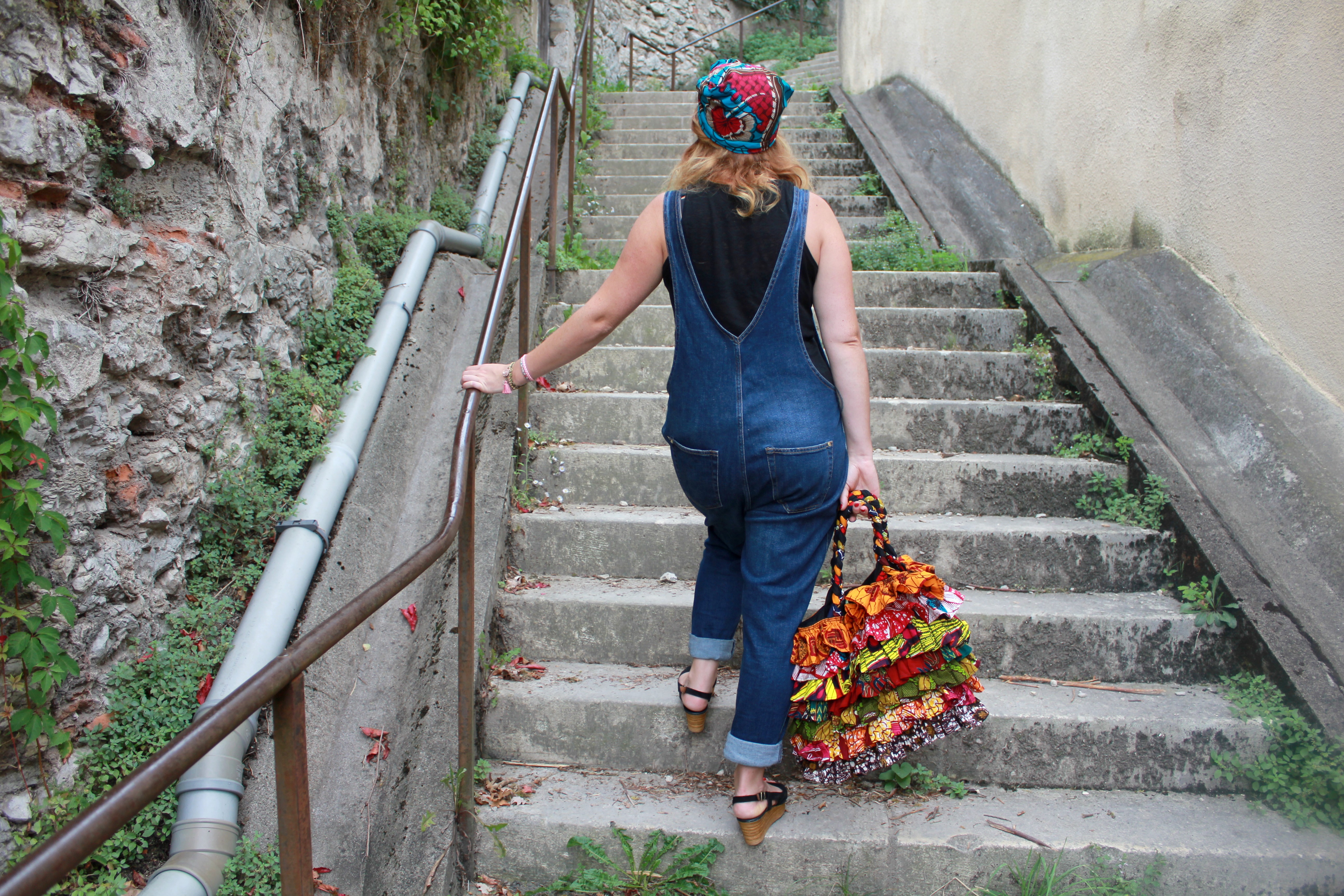 Salopette: Mango / débardeur: Etam / sac: Miss Eben Cicefa / foulard turban: Mamzel Tutu / chaussures: André / Manchette: Mamzel Tutu