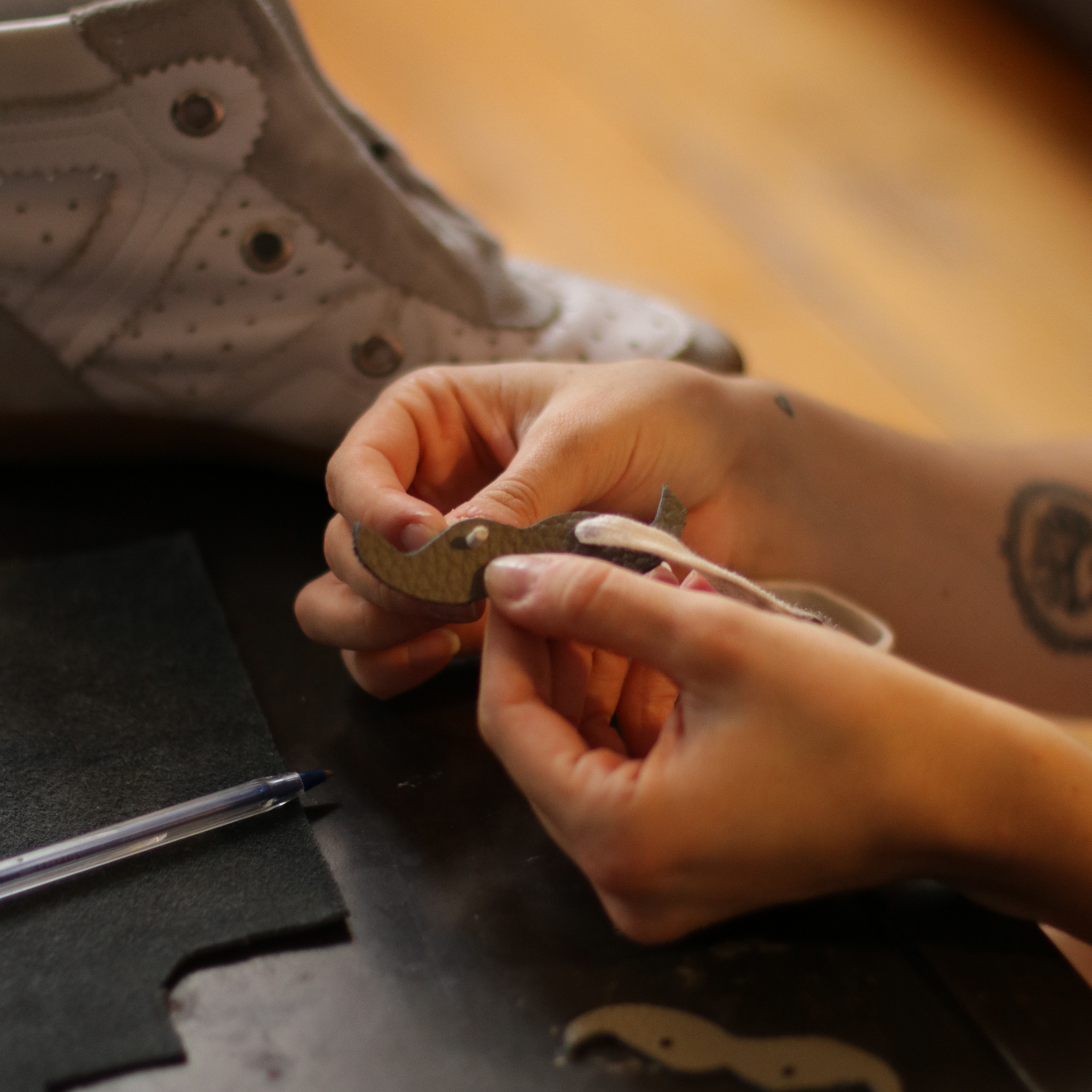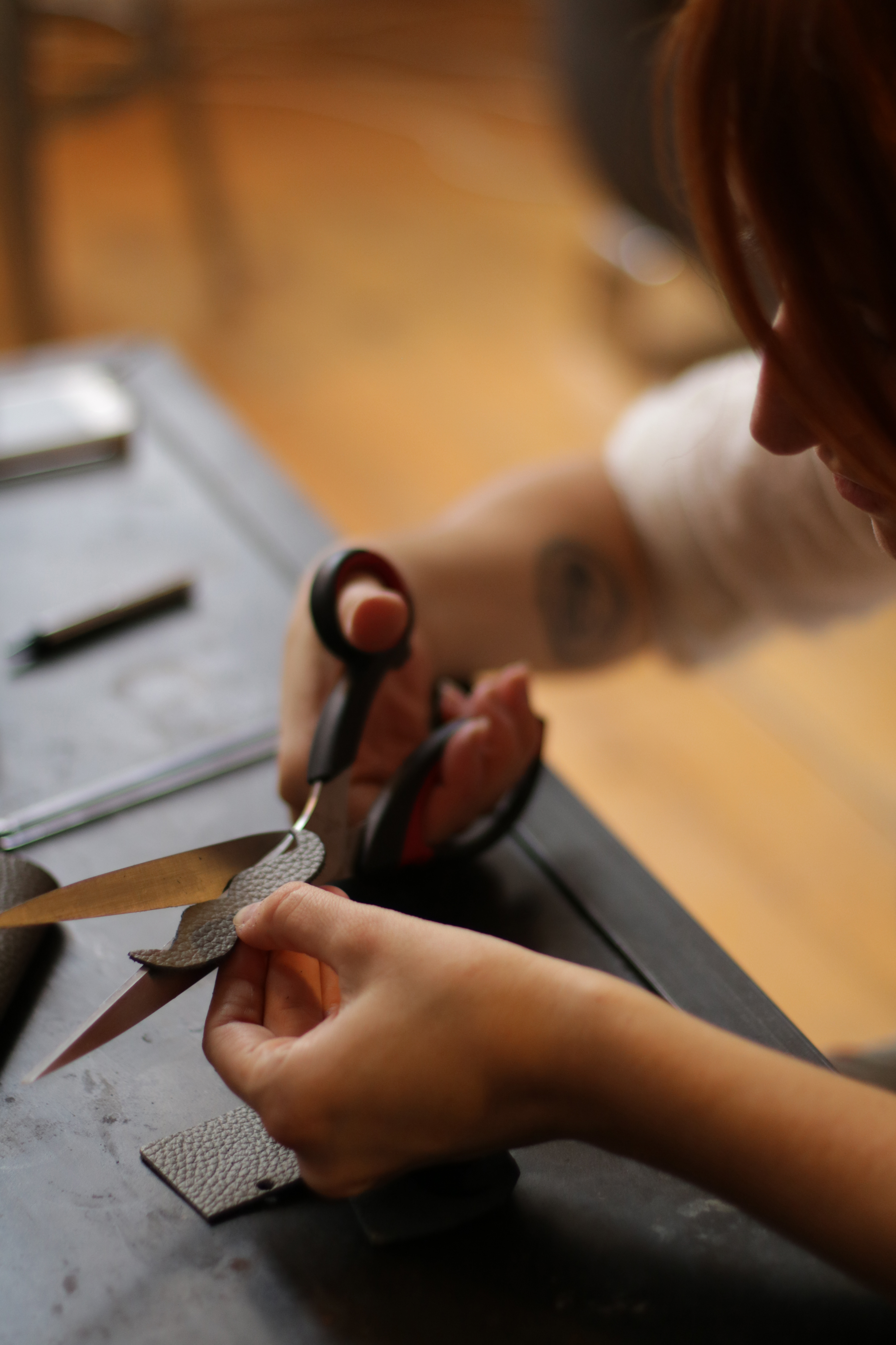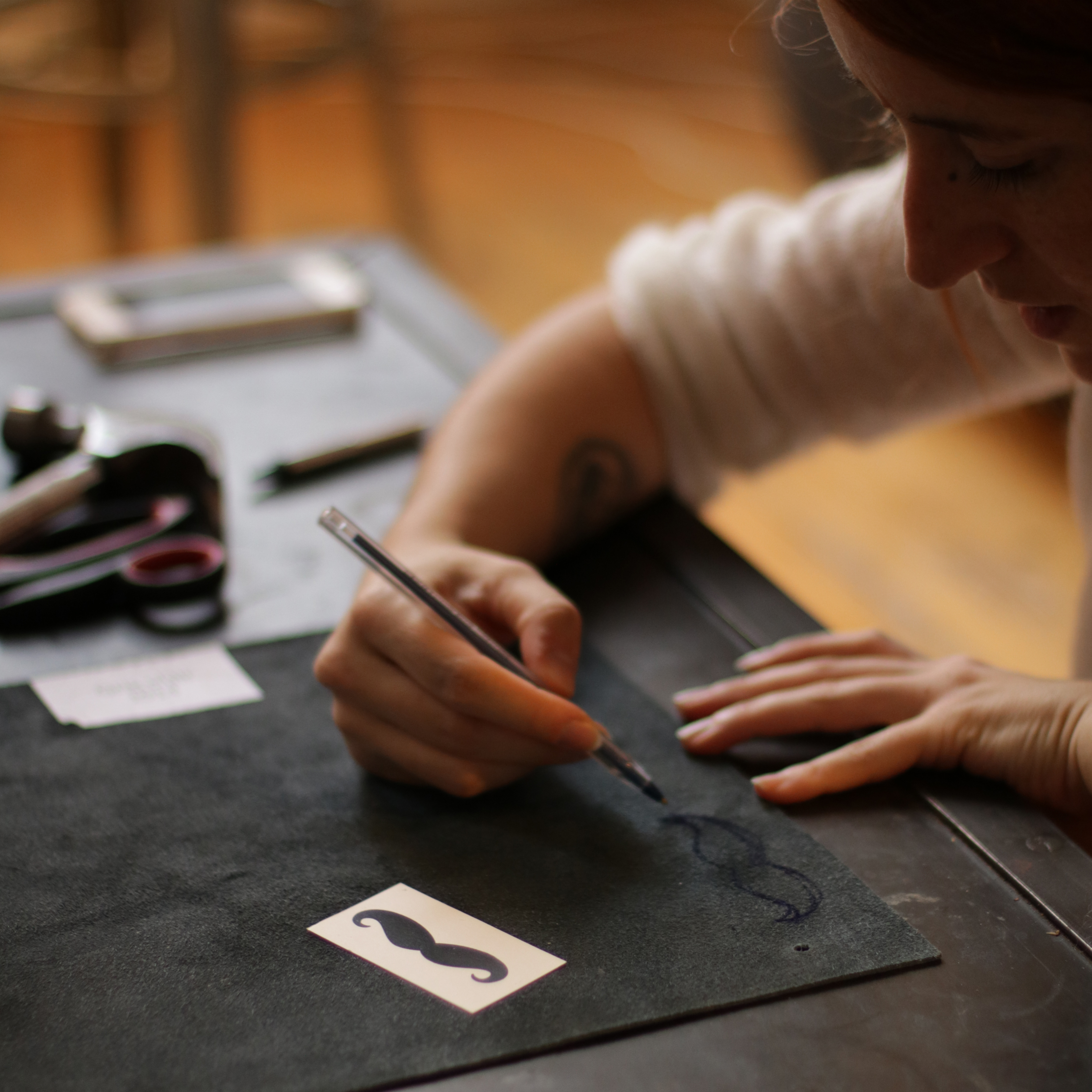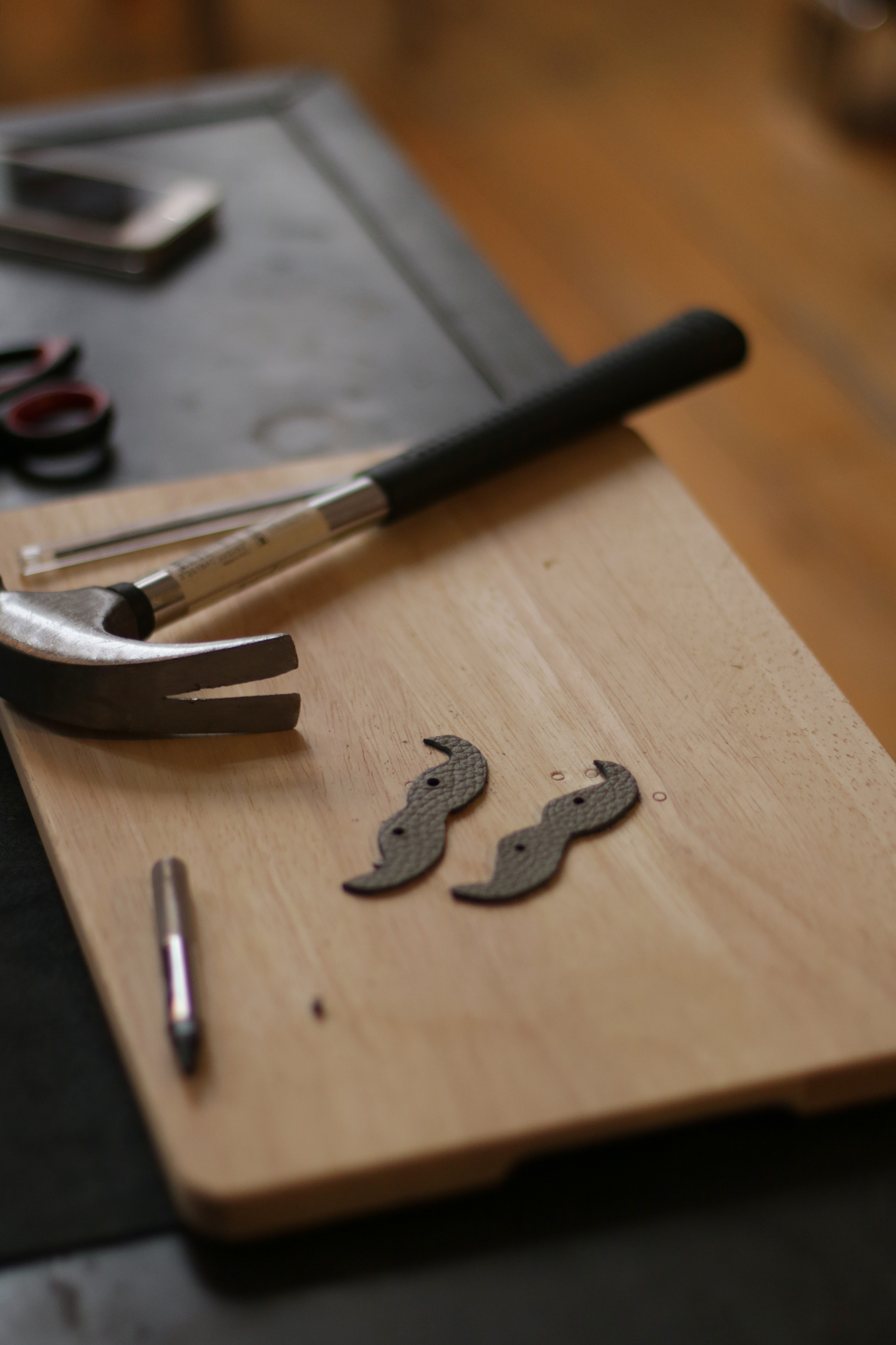 Etape 4: Perforez vos moustaches. J’ai choisi d’utiliser cet emporte pièce pour faire un trou adapté à l’épaisseur de mes lacets. Pensez bien à protéger votre table si vous utilisez un marteau, ça défoule mais ça peut aussi faire des dégâts…