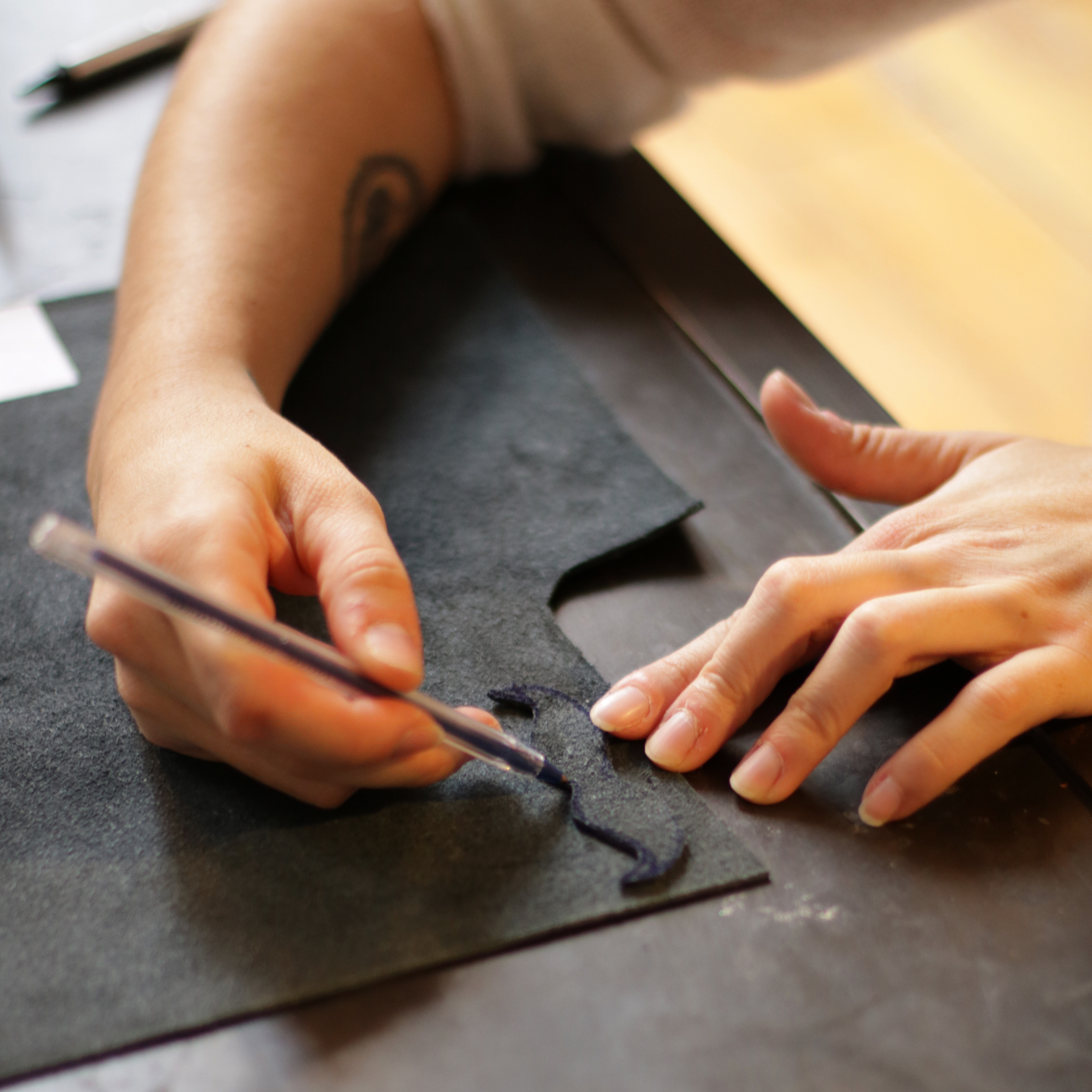 Etape 1: Dessinez la forme choisie sur votre cuir. J’ai dessiné à main levée ( le talent quoi…) mais je vous conseille fortement d’imprimer le motif et de le reporter sur votre cuir pour un rendu plus précis. Pensez bien à dessiner sur l’envers du cuir.
