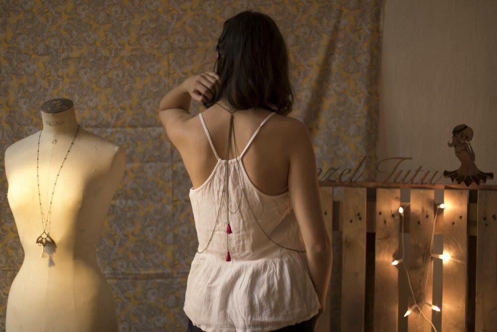 J’ai pas trouvé sur le site mais c’est le bijou de dos avec les pompons… 😍 il est top et je veux bien le liens stp bizzzz