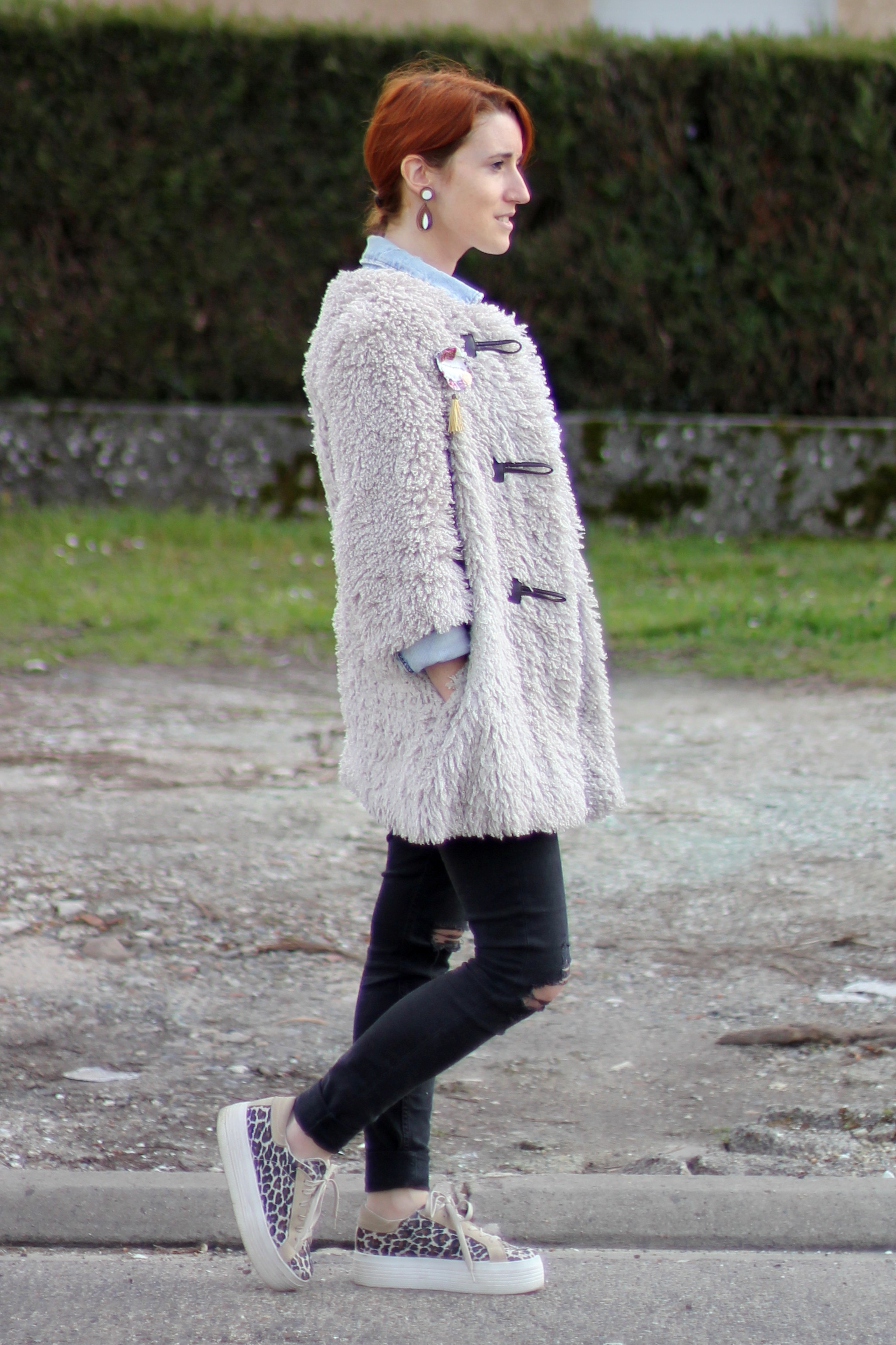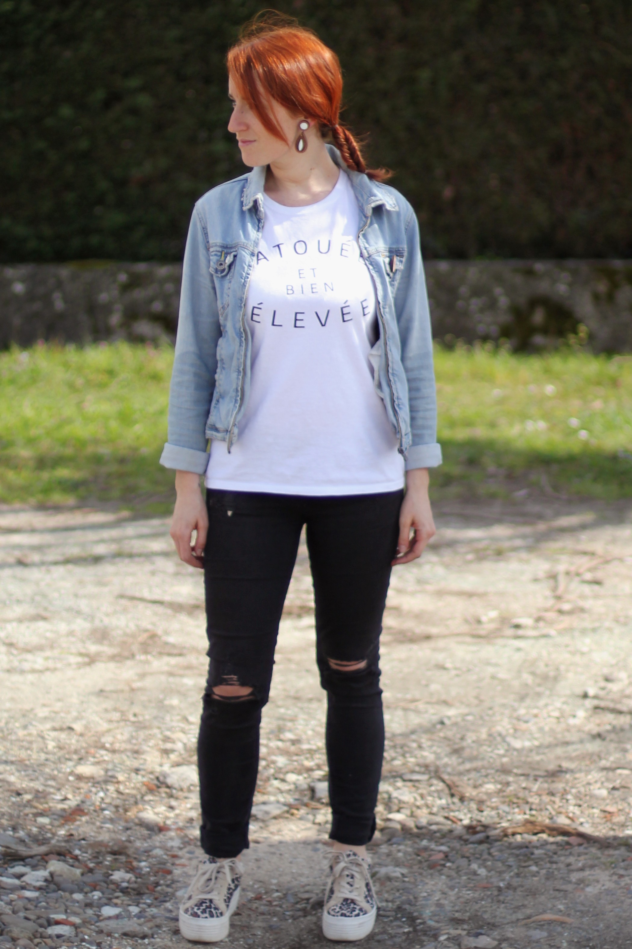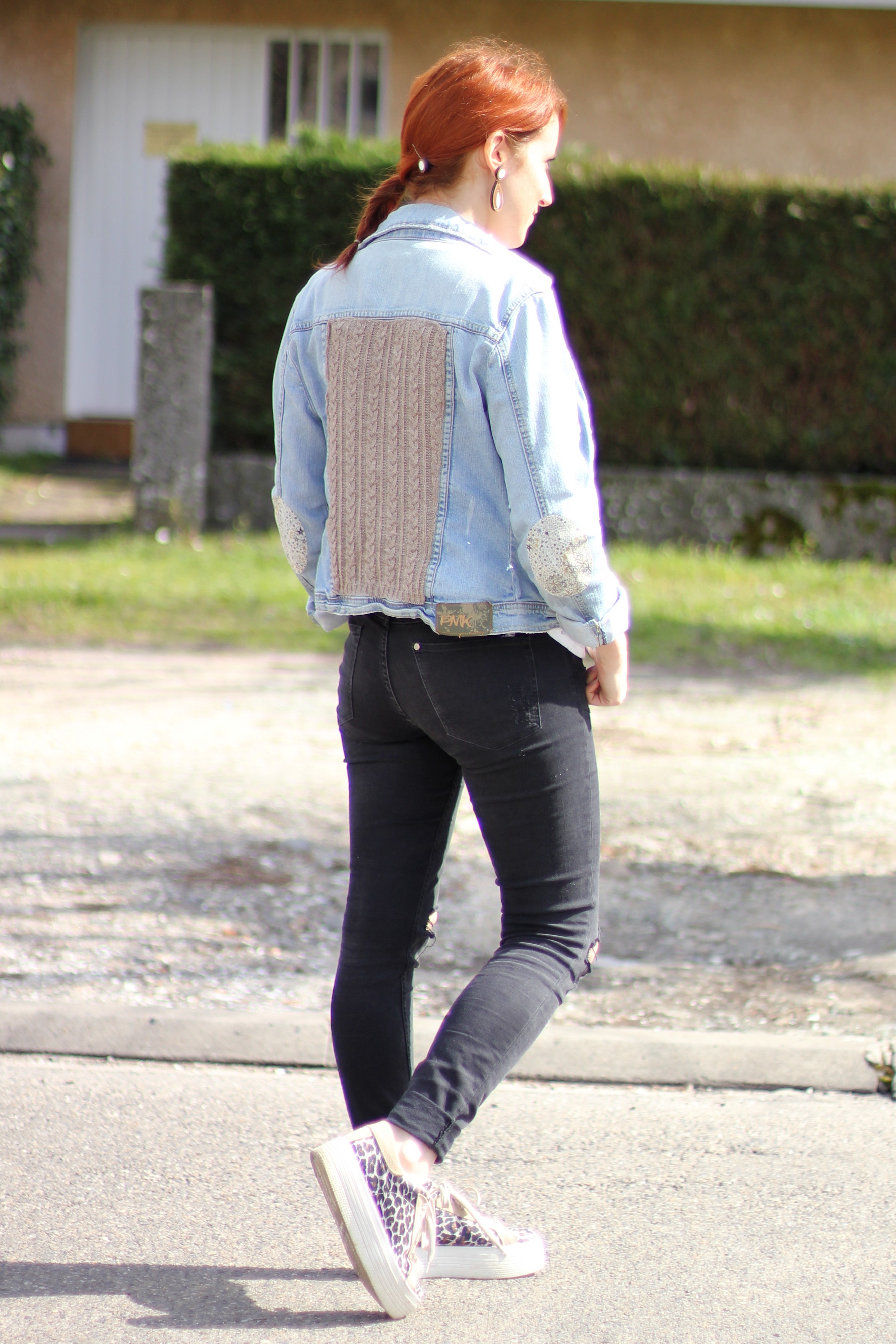 Veste moumoute Cop Copine / Veste en jean DIY / T-shirt Deparis / Jean H&M / basket Ipon Vintage / bijoux Mamzel Tutu / Broche Punkster