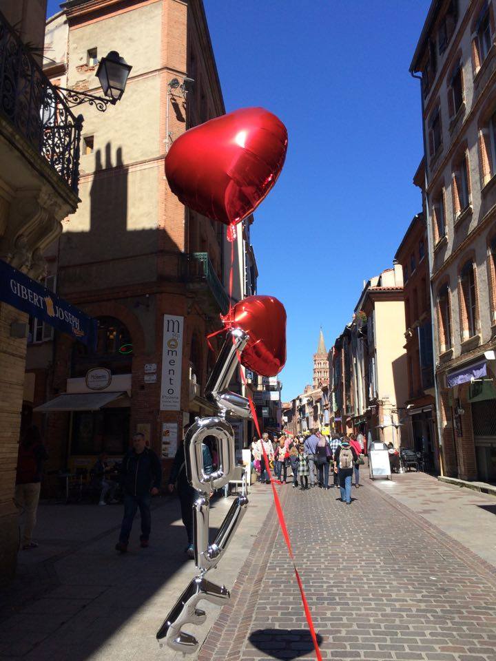 Solution: ne pas se laisser envahir par la détresse, la déception et l’énervement  ! Avec les 26 lettres de l’alphabet on est large pour trouver une alternative. Alors on passe au plan B. Gonfler, à l’hélium cette fois, deux gros ballons en forme de cœur pour accrocher les lettres LOVE en vertical et qu’ils puissent porter mon amour vers le (7 éme ?!) ciel. Ah ah !