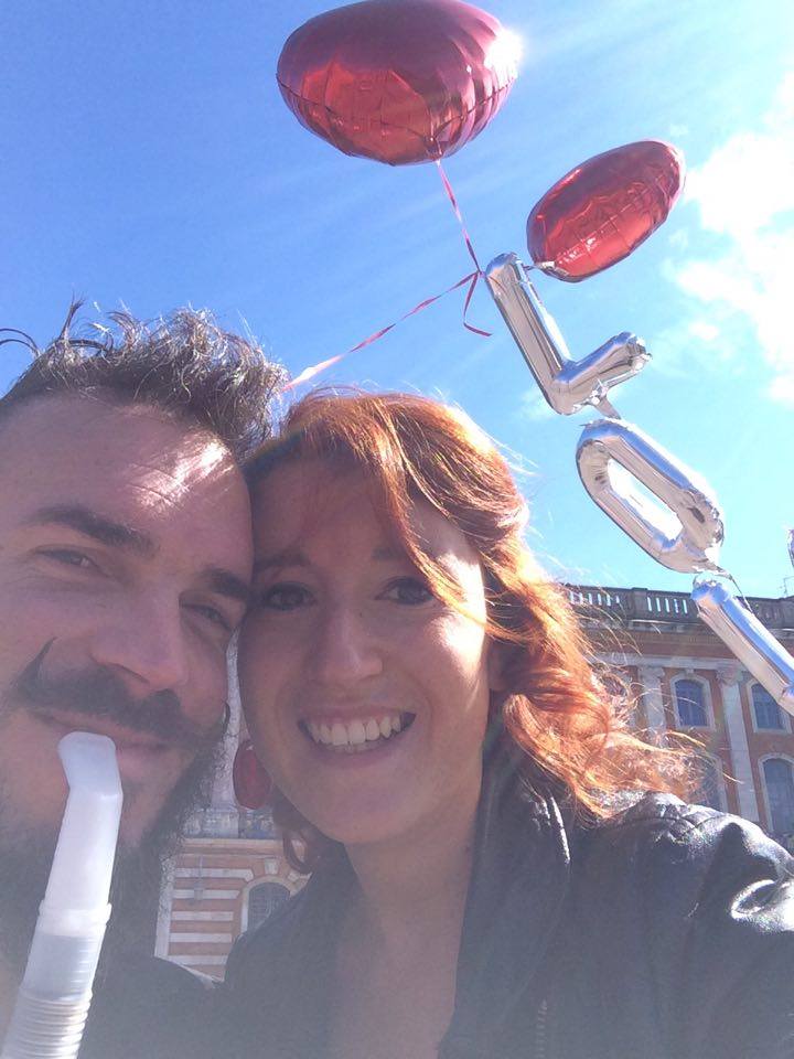 2. Vous êtes trop beaux tous les deux et l’amour vous va si bien ! Super idée pour marquer vos 1 an ! C’est très trèèès romaaaantiique… ❤❤🎈 Dommage que l’on ne puisse admirer de près les boucles d’oreilles faites avec amour ❤❤ par ton chéri ! Elles sont rouges, non ??