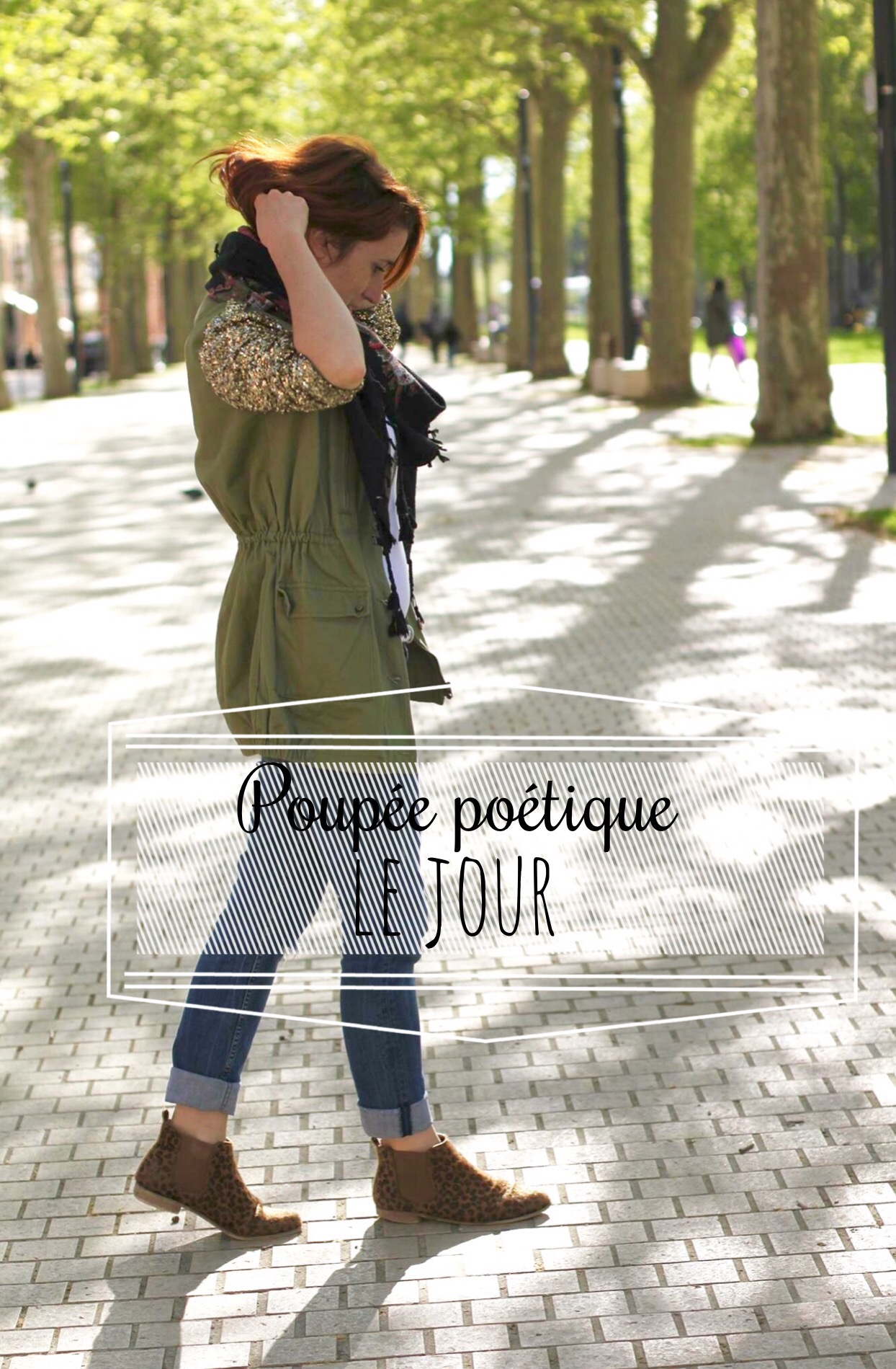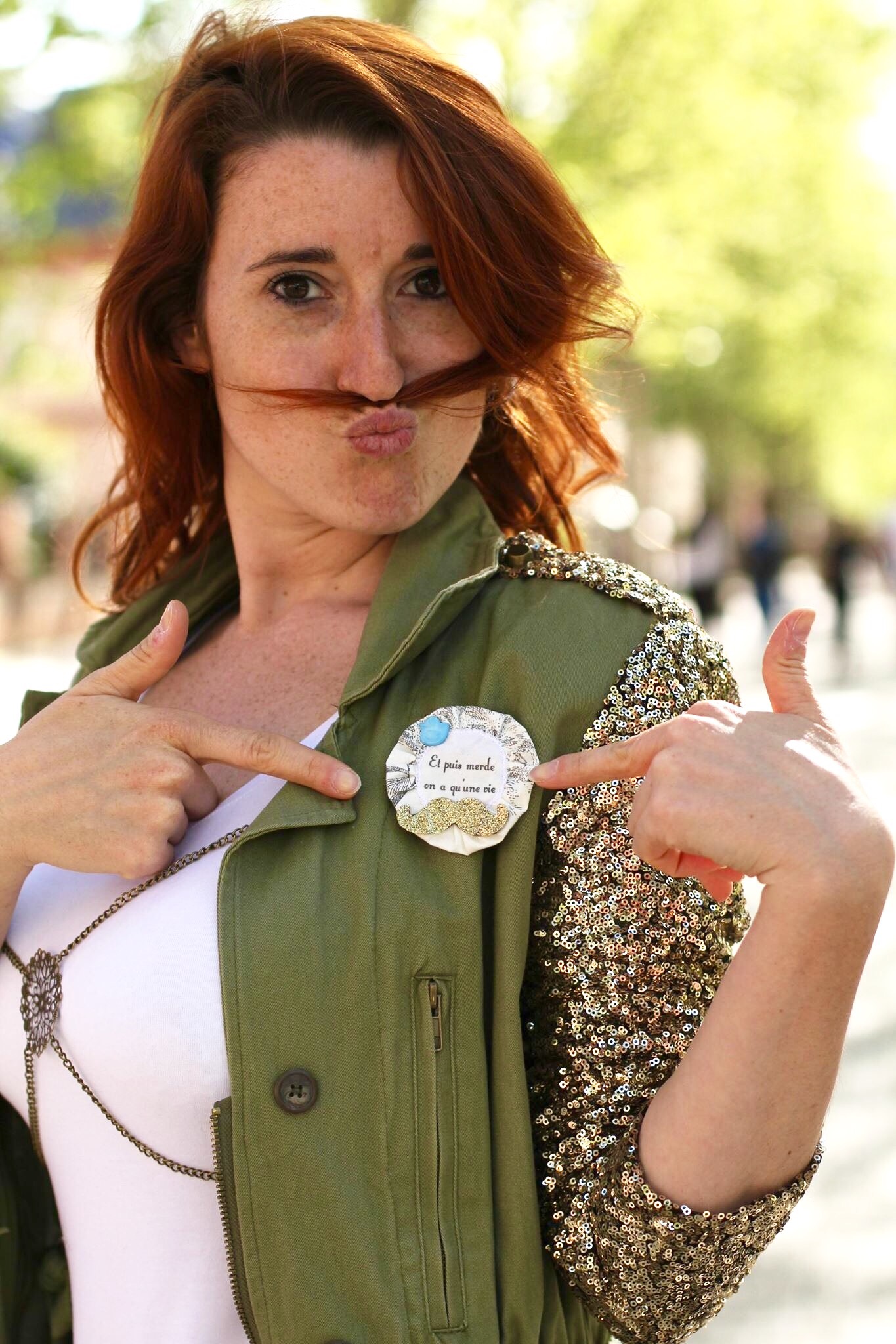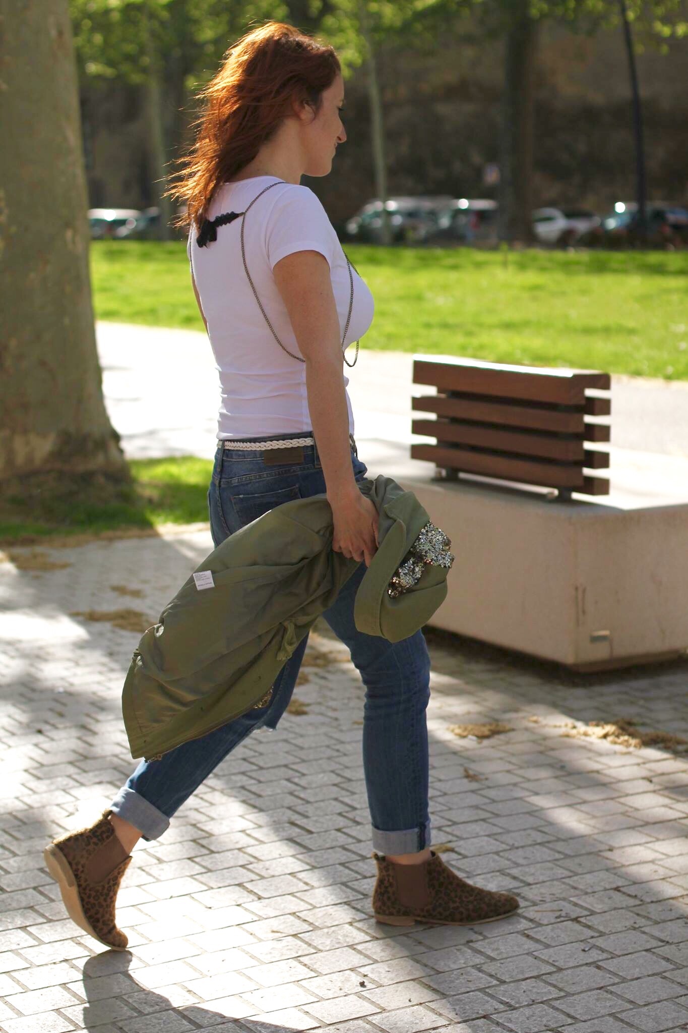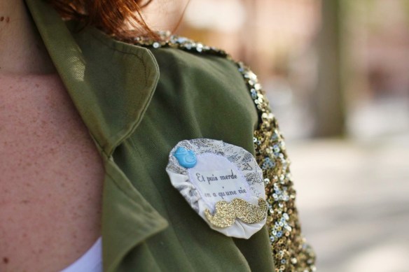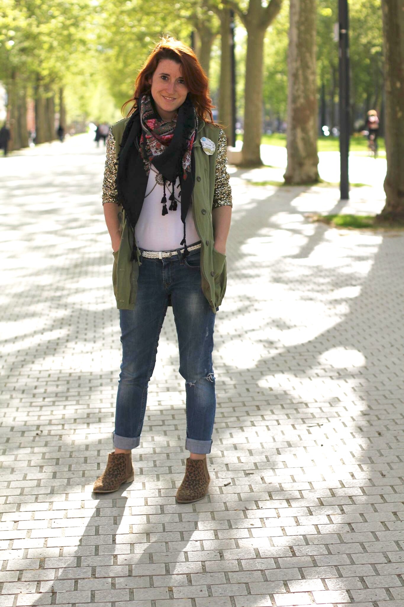 Combo jean / t-shirt blanc relevé grâce à la chaine de corps « triangle » et ma veste kaki à paillettes.
