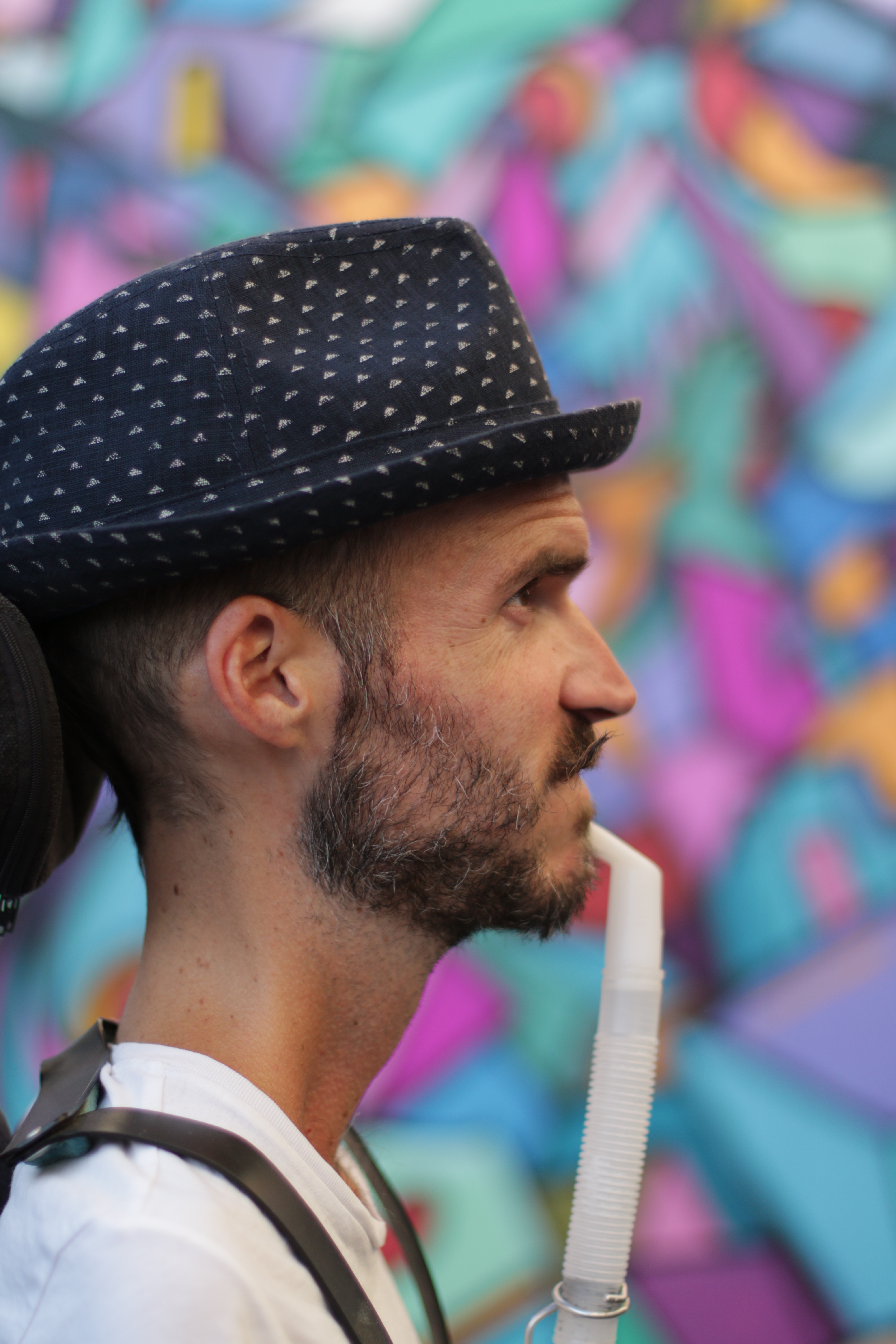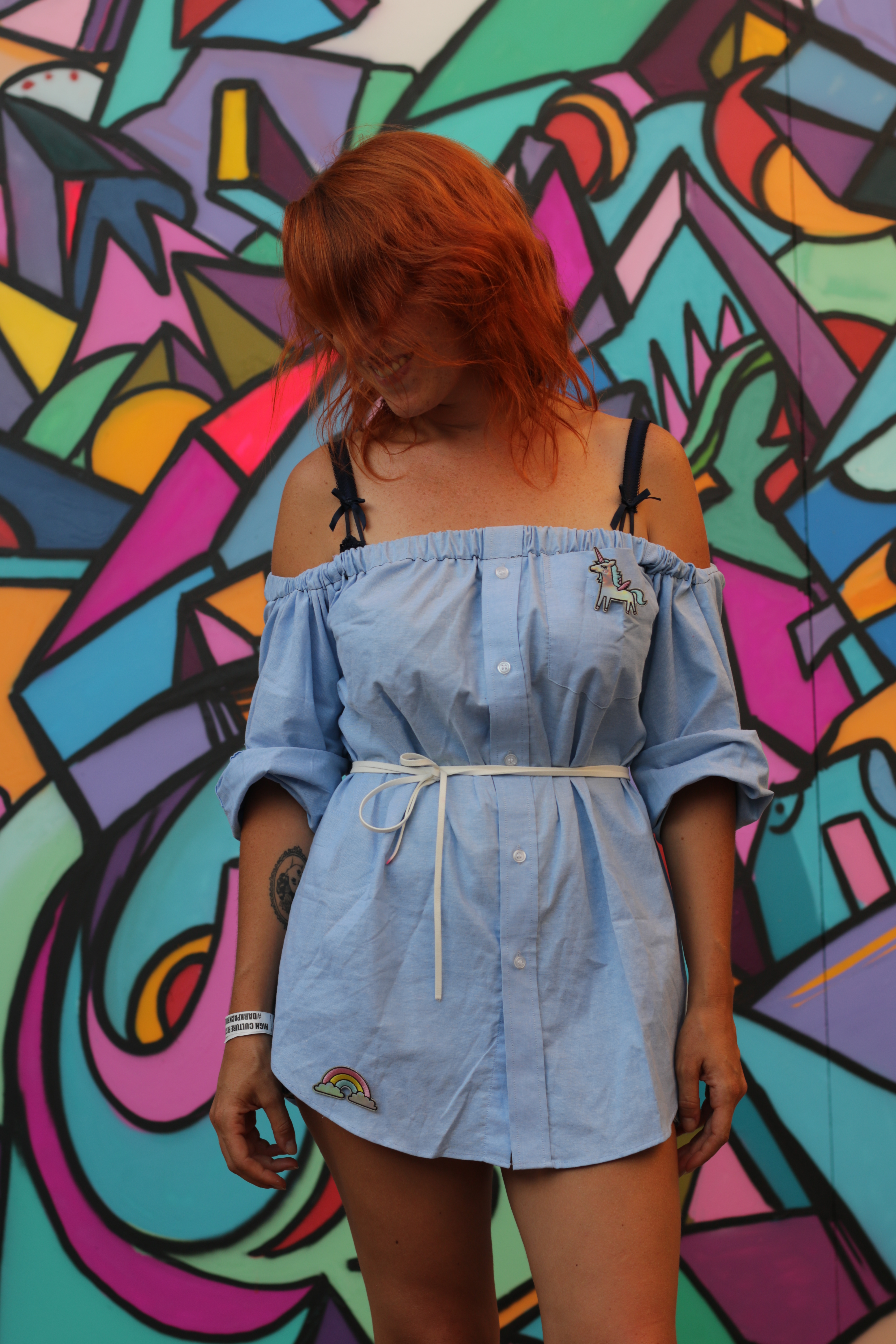 Aussitôt sec, j’ai accroché la licorne et l’arc en ciel à ma chemise et mon beau barbu m’a pris en photo devant l’œuvre de Léo.