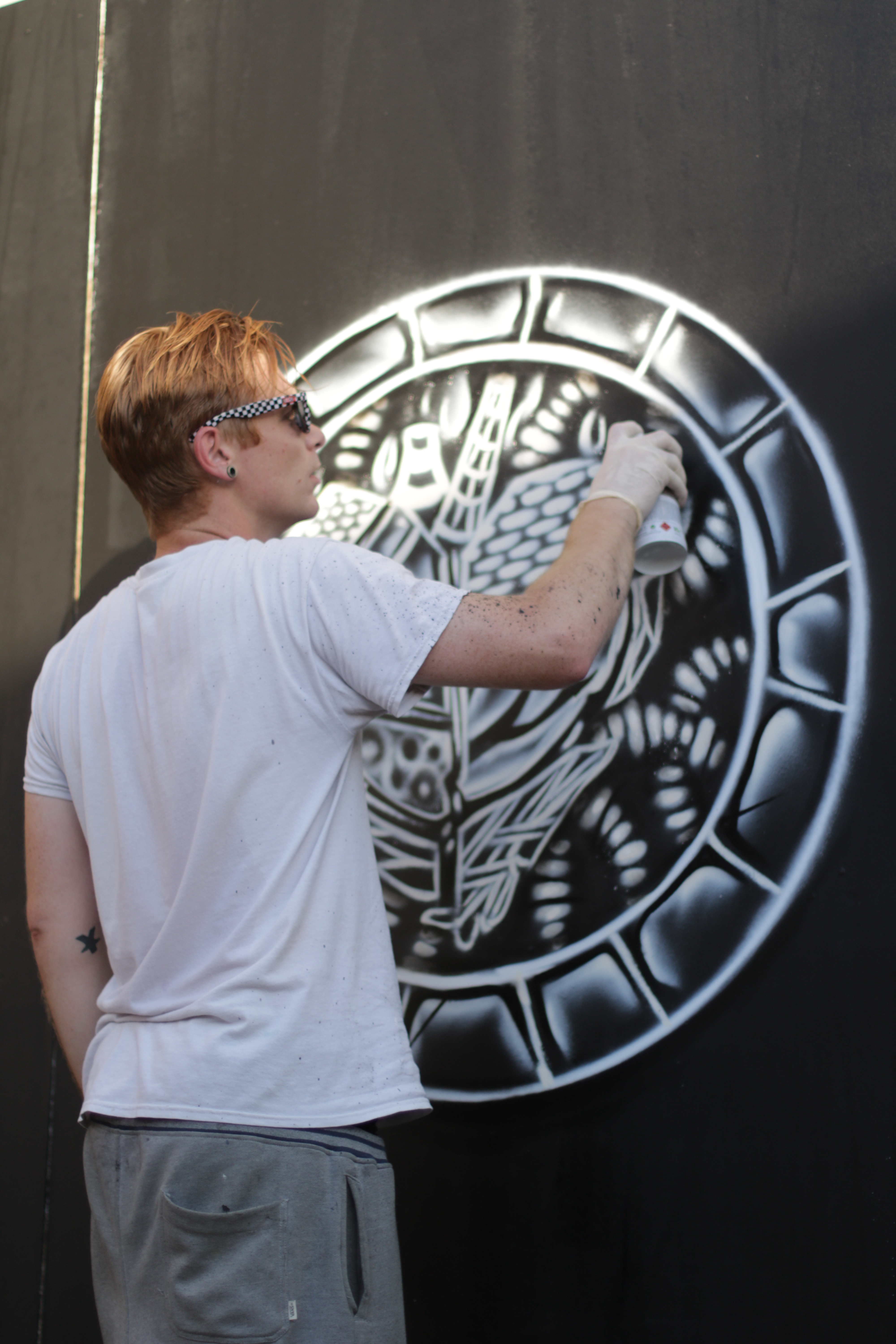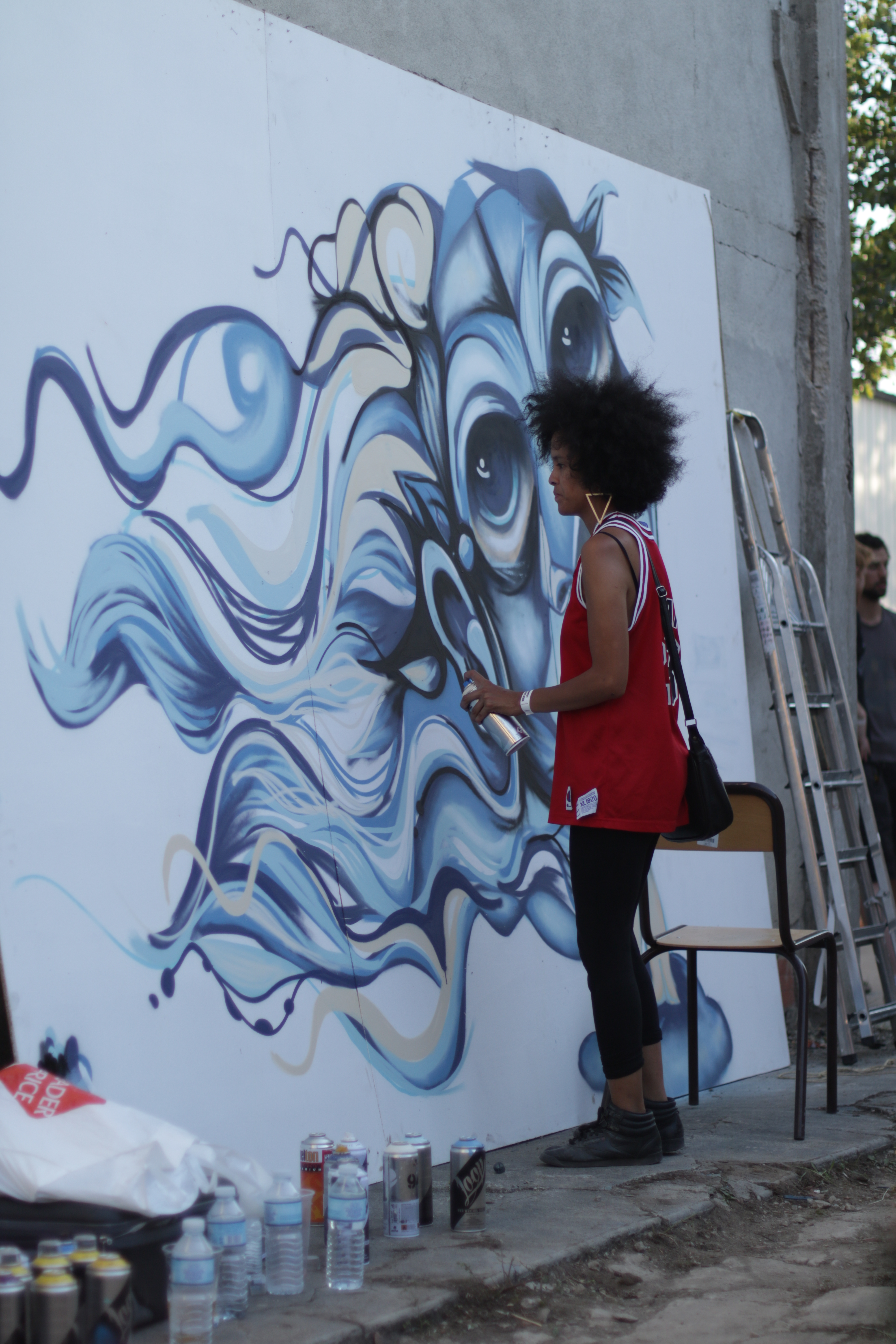 Je voulais coller ces patchs à la maison mais j’avais le matos dans mon sac et regarder ces personnes dessiner sur ces planches de bois m’a démangé les phalanges. J’ai donc transformé ces patchs en regardant mon pote Léo graffer, tranquillement assise sur une palette, sous 45 degrés à l’ombre. Baaaam on était bien là !