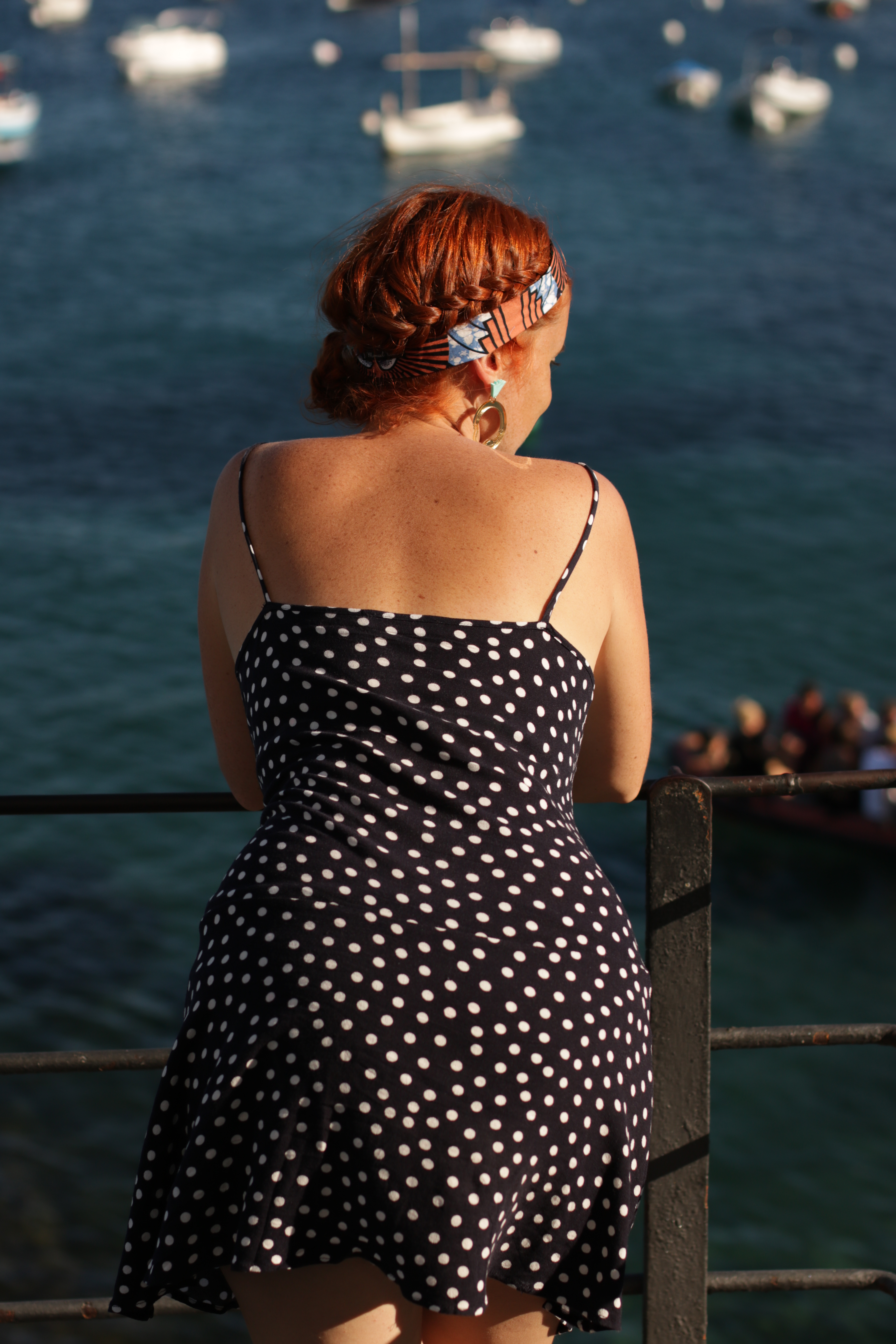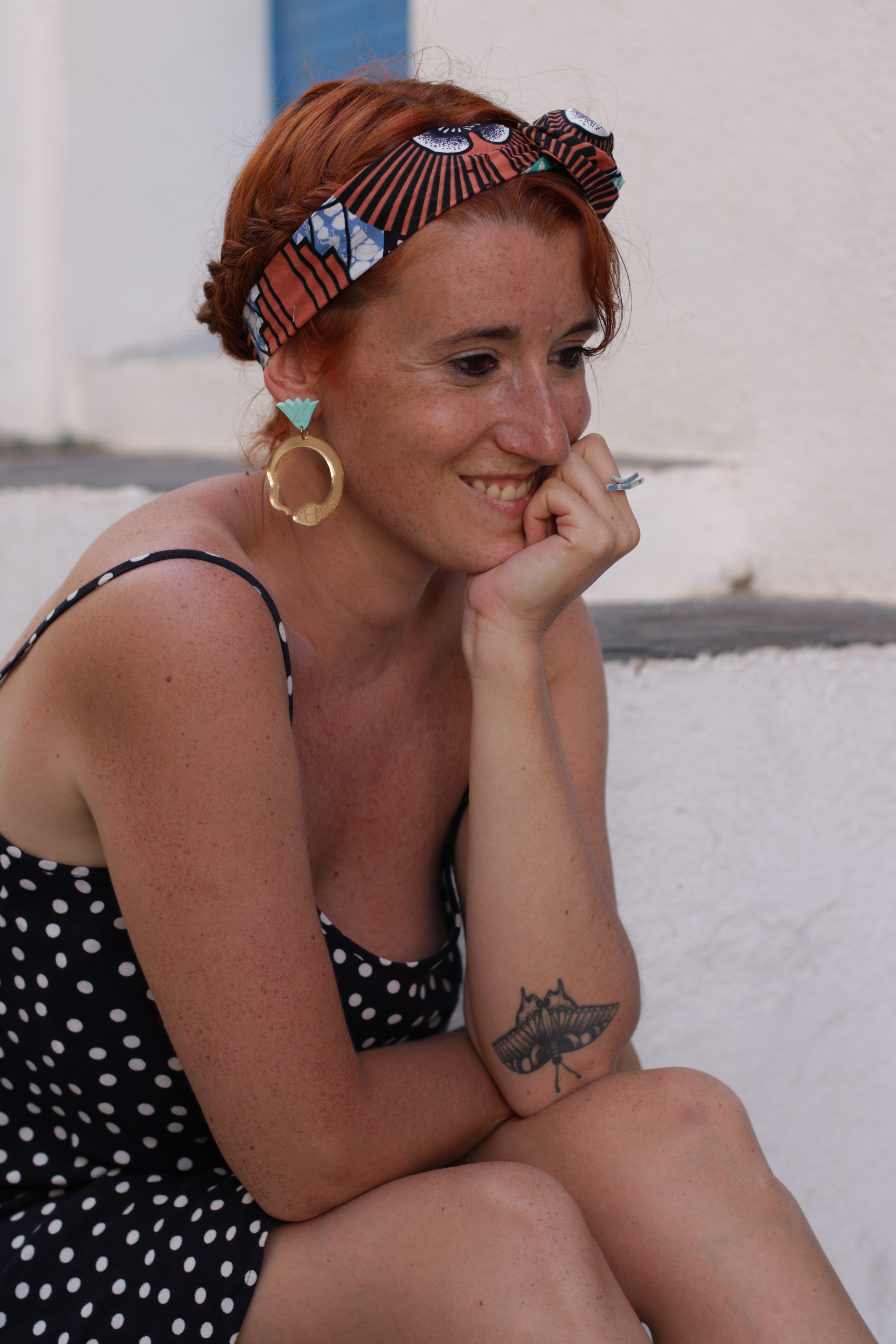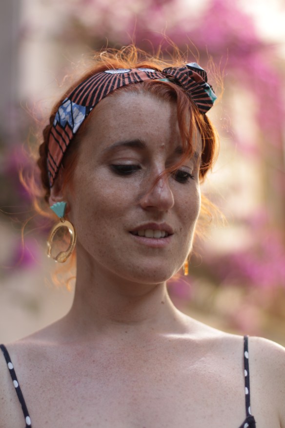 Parfois j’ai l’impression d’avoir 4 ans quand je m’habille. J’ai envie de porter tel et tel vêtement ou accessoire en sachant que cela n’ira pas vraiment ensemble. Et après tout qu’est ce que ça peut faire ? Pour me balader dans les jolies ruelles de Cadaqués, j’ai donc mixé la petite robe à pois, les grosses boucles bling bling et le headband en wax.