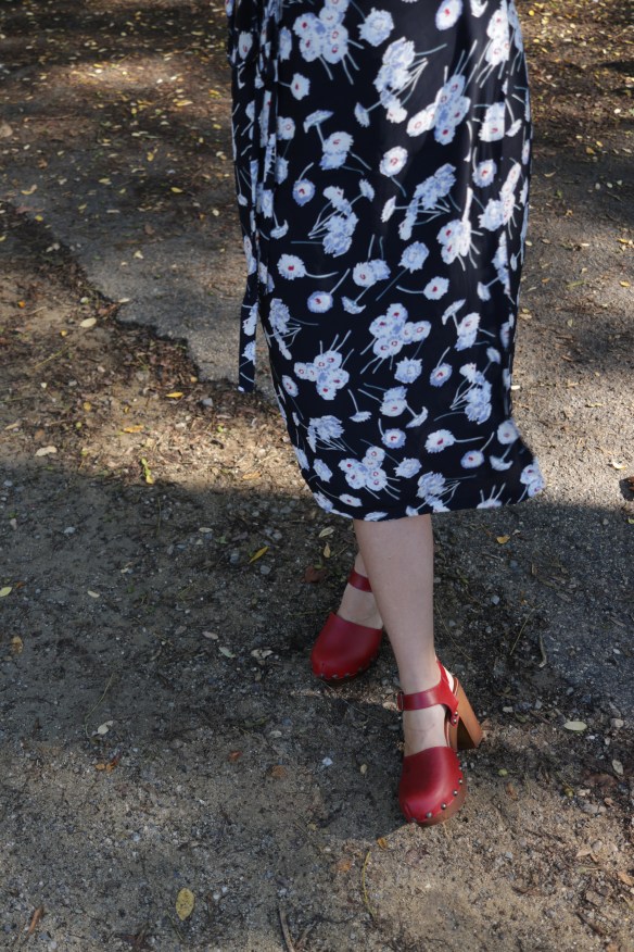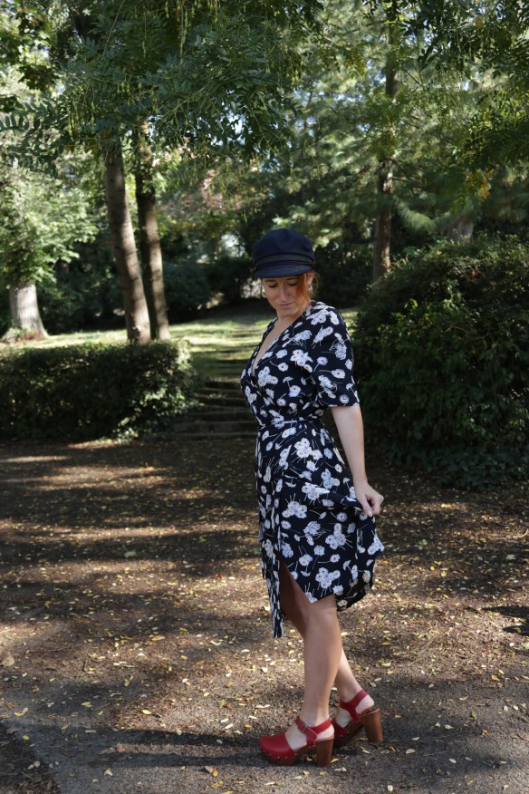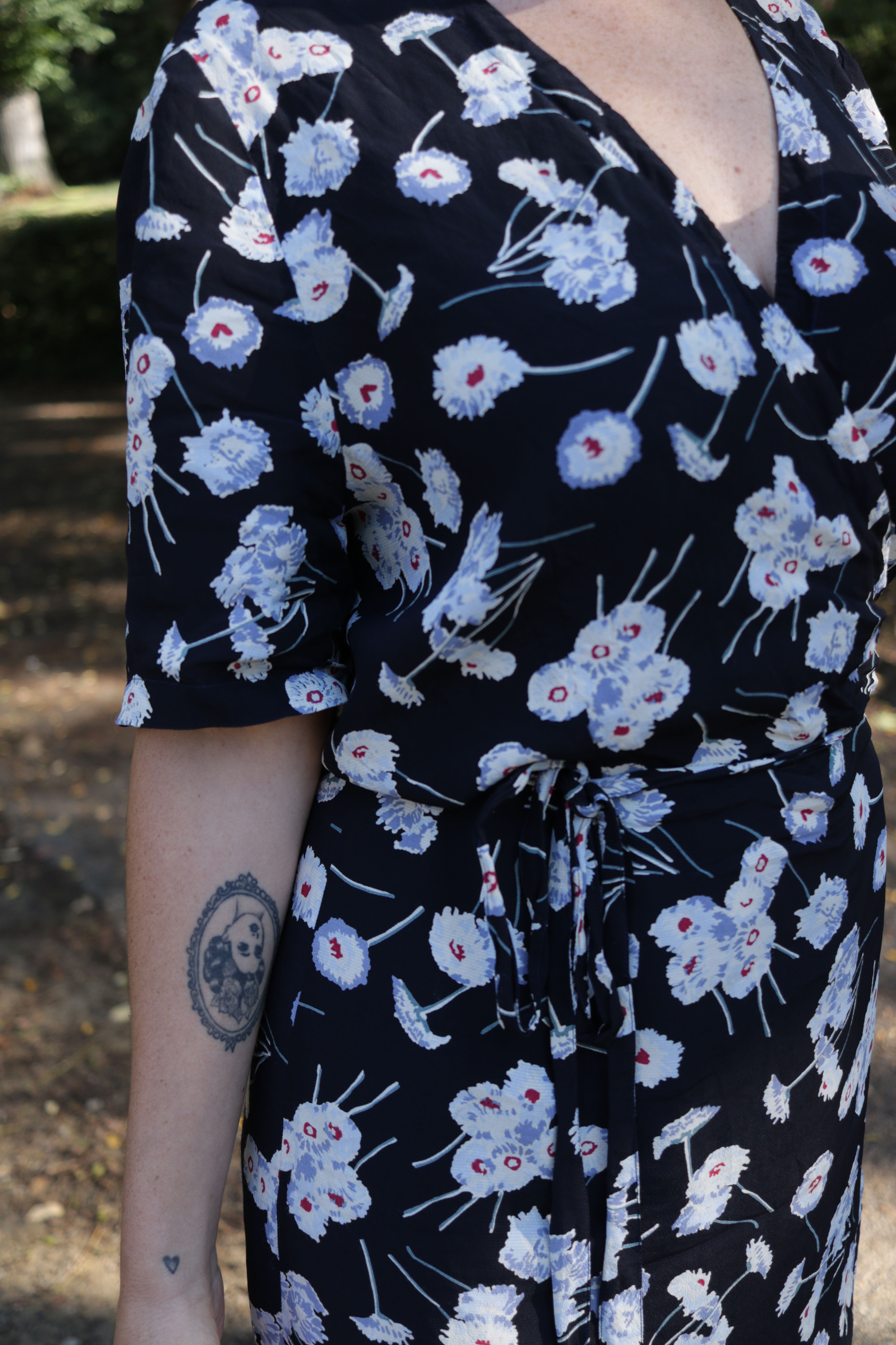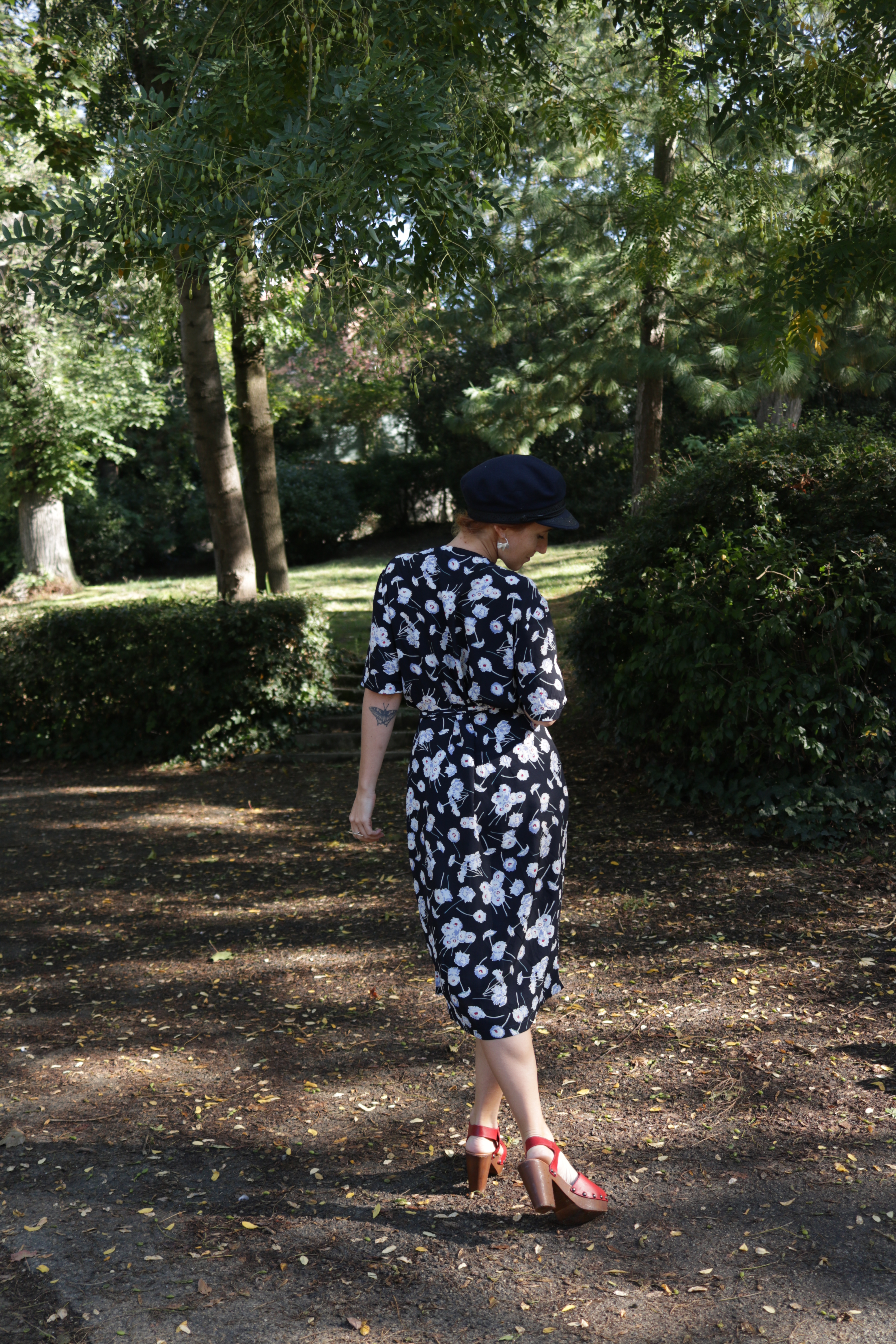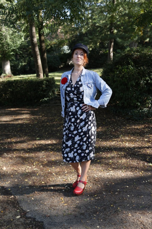 Donner une seconde vie aux vêtements délaissés, c’est un peu une passion pour moi. Je transforme des chemises d’homme pour en faire des robes et chemisiers pour femme. Je customise des blousons en jean ou des vestes militaires qui deviendront ensuite des pièces originales, uniques et féminines. Ici, il est aussi question de seconde vie pour cette robe portefeuille. Je ne l’ai absolument pas transformée, je l’ai simplement achetée à Laura, chineuse professionnelle pour Les p’tites pépées. Ses trésors sont des vêtements qui ont au moins 20 ans d’âge. Laura a du goût, il n’y a qu’à voir son compte instagram (@lesptitespepees) où elle vous présente des idées looks avec les articles qu’elle revend sur son site internet. Mixer des pièces vintage avec des pièces actuelles, voilà un art qu’elle maitrise parfaitement.