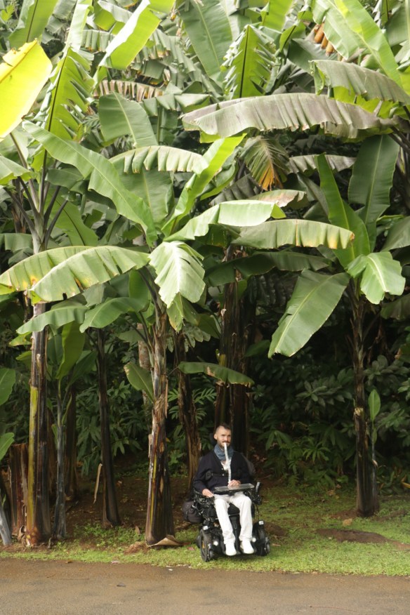 Ce n’est pas notre seule façon de prendre des photos. Parfois c’est moi qui tiens l’appareil photo, pendant nos voyages ou lorsque nous photographions d’autres modèles. D’autres fois, je suis seule dans la rue, face à l’appareil photo hissé sur un trépied, le téléphone à la main en tentant de le cacher sur les photos. Les passants sont tout autant interloqués et me proposent même parfois leur aide. Et enfin, Johann et moi aussi souvent œuvrons seuls : puisque l’appareil photo possède également un écran orientable, Johann peut le poser sur la tablette de son fauteuil et déclencher du bout du doigt. Ses possibilités de cadrage sont alors un peu limitées et c’est moi qui bouge, en prenant des positions parfois incongrues, pour m’adapter à ce qu’il veut. Là encore, l’envers du décor n’est pas triste à voir, croyez-moi ! Bien sûr, nous nous servons enfin régulièrement du trépied, lorsque nous souhaitons faire des photos en plan fixe, comme cela a été le cas pour ces portraits sur fond rouge.